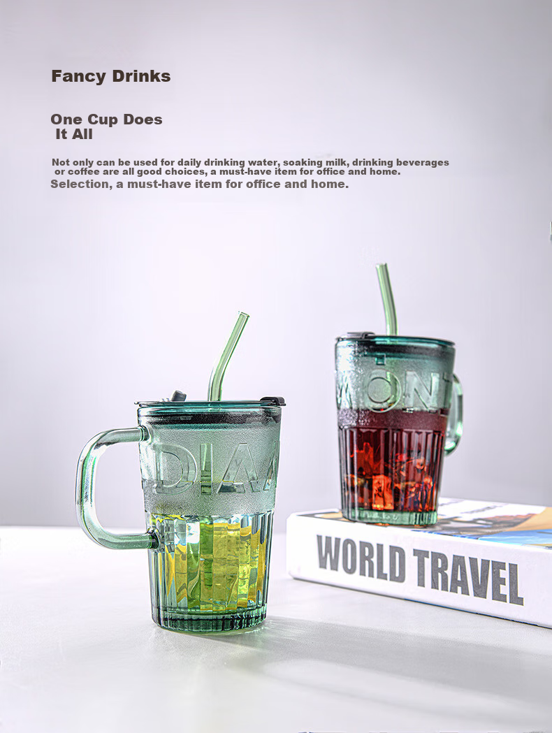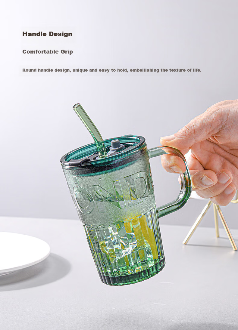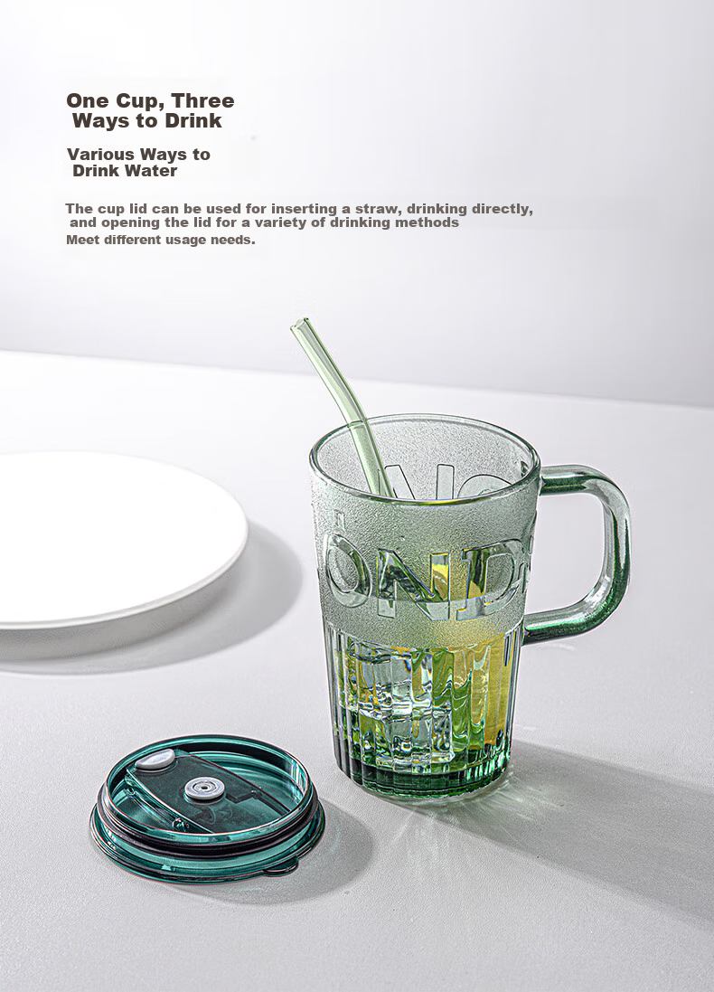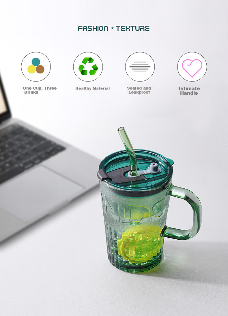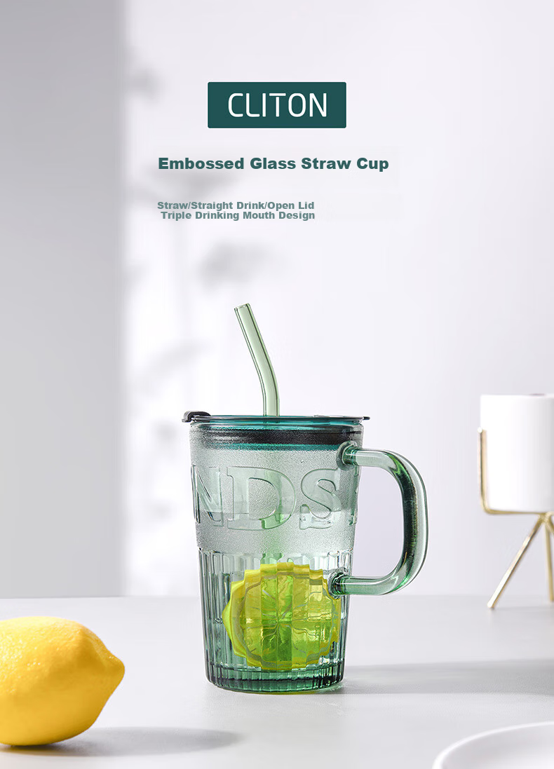 Additional Information: Straw material is high borosilicate glass; silicone seal for leak-proof lid; suitable for travel; versatile drinking options with lid for straw, direct, and open drinking; comfortable round handle design; suitable for office and home use.