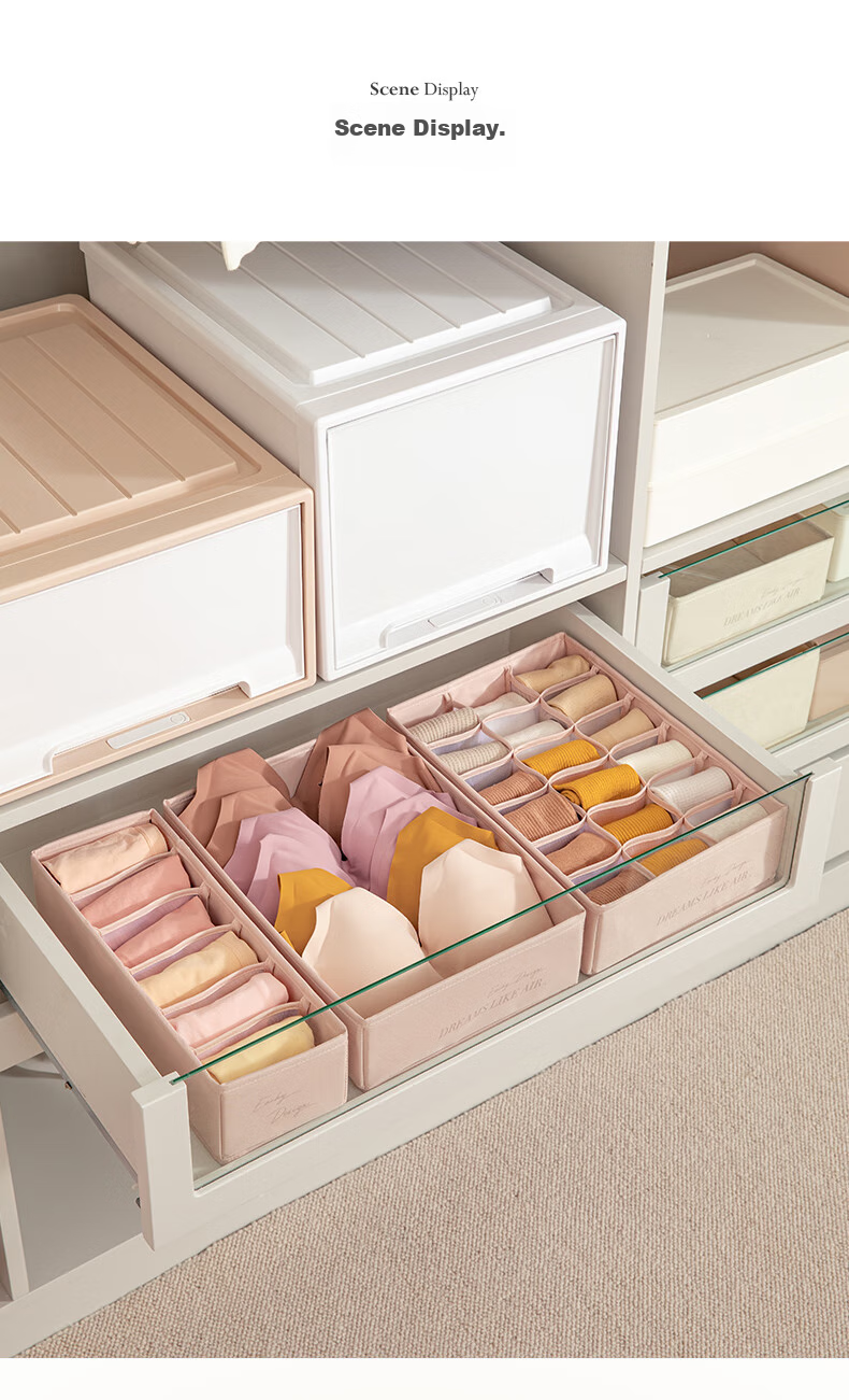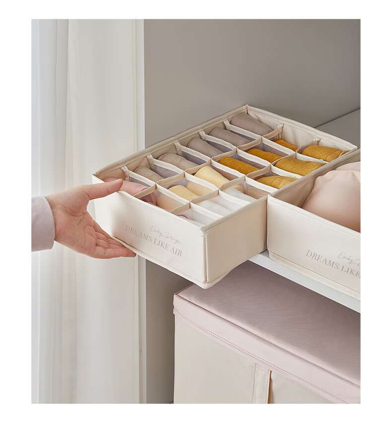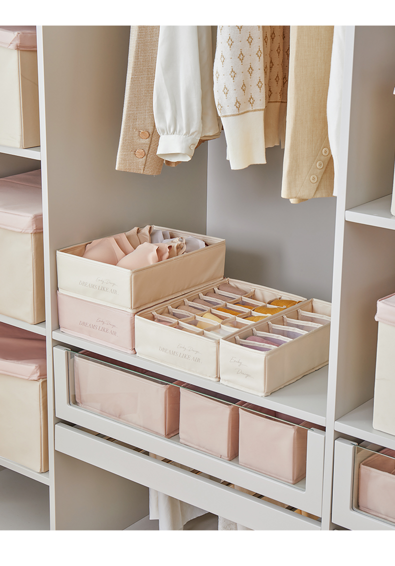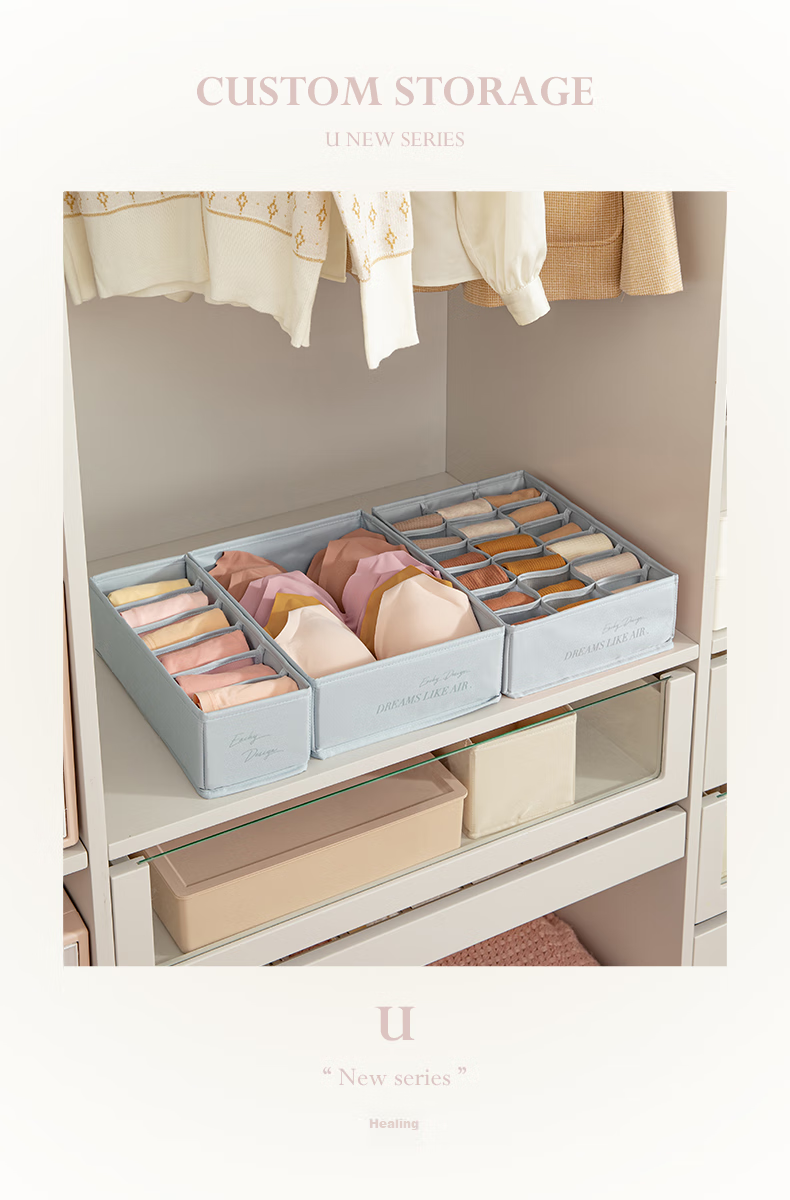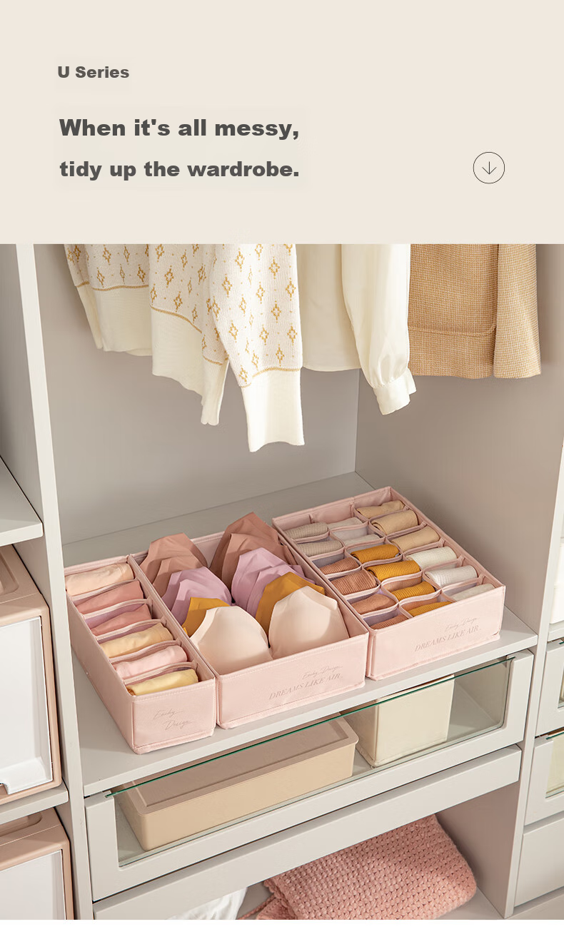 Storage: Exclusive storage U series for organizing wardrobe, available in multiple sizes including underwear storage box, socks storage box, with 6 or 18 compartments.