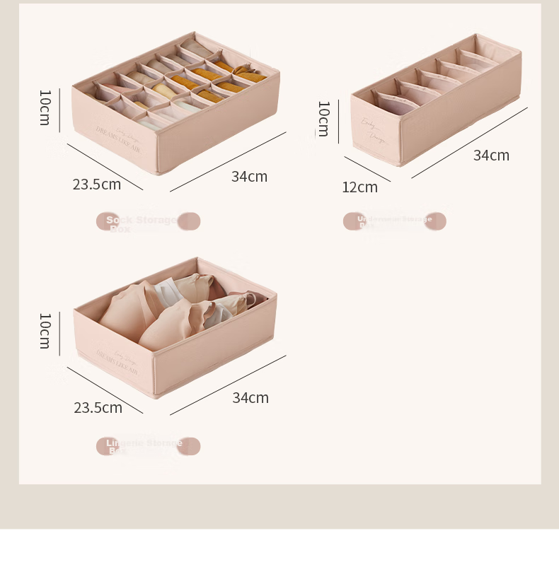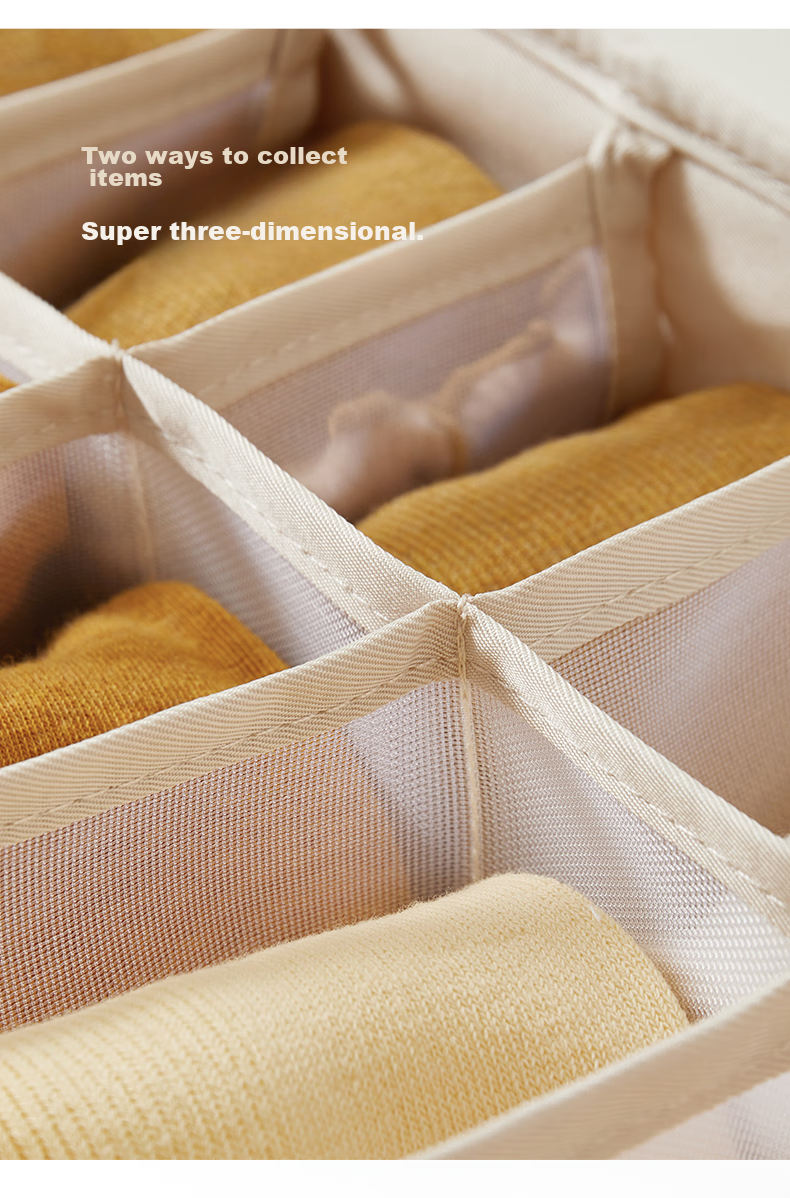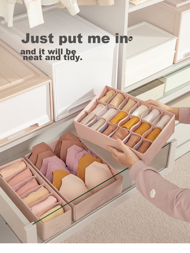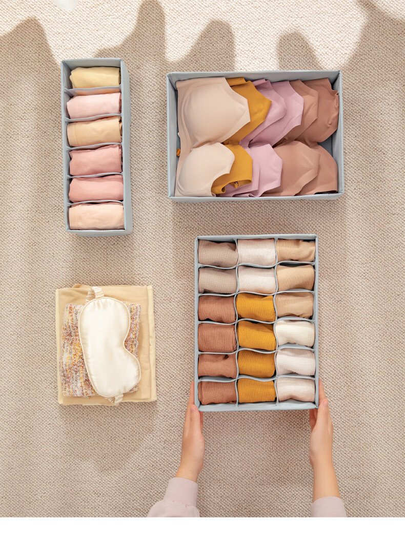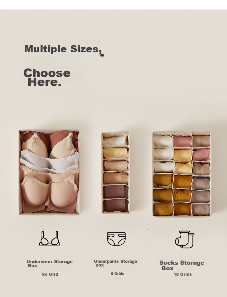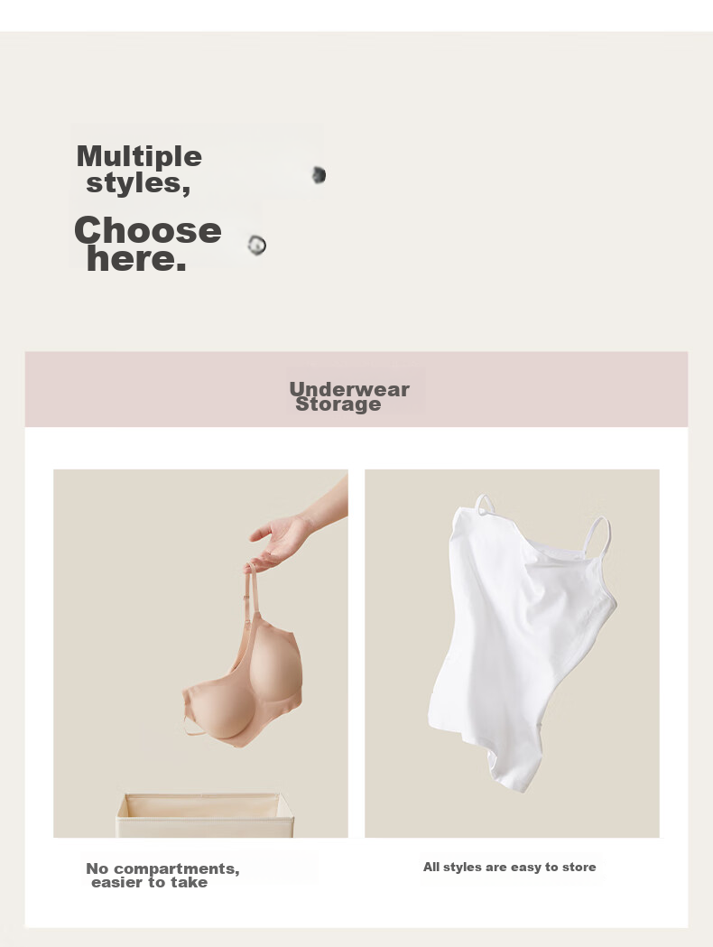 Storage: Exclusive storage U series for organizing wardrobe, available in multiple sizes including underwear storage box, socks storage box, with 6 or 18 compartments.