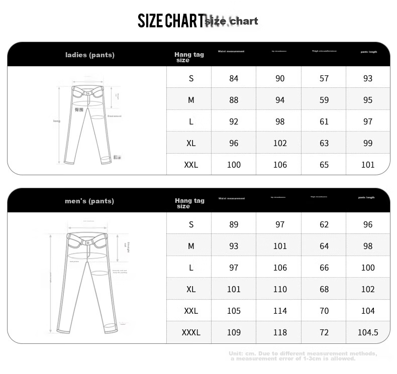 - *Men's Pants:* S, M, L, XL, XXL, XXXL