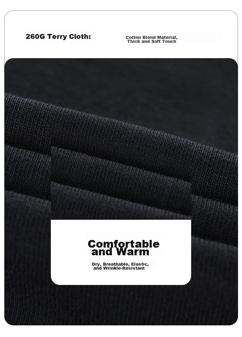 **Fabric:** 260G looped fabric, cotton blend material, thick and soft touch, comfortable, warm, dry, breathable, elastic, and wrinkle-resistant