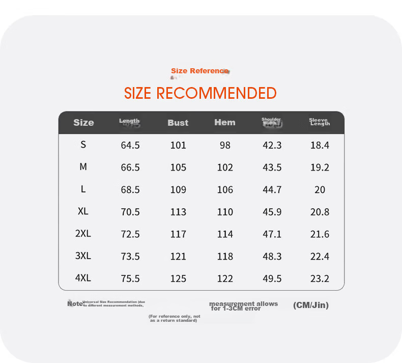 - 3XL: Length 73.5cm, Chest 121cm, Hem 118cm, Shoulder 48.3cm, Sleeve 22.4cm