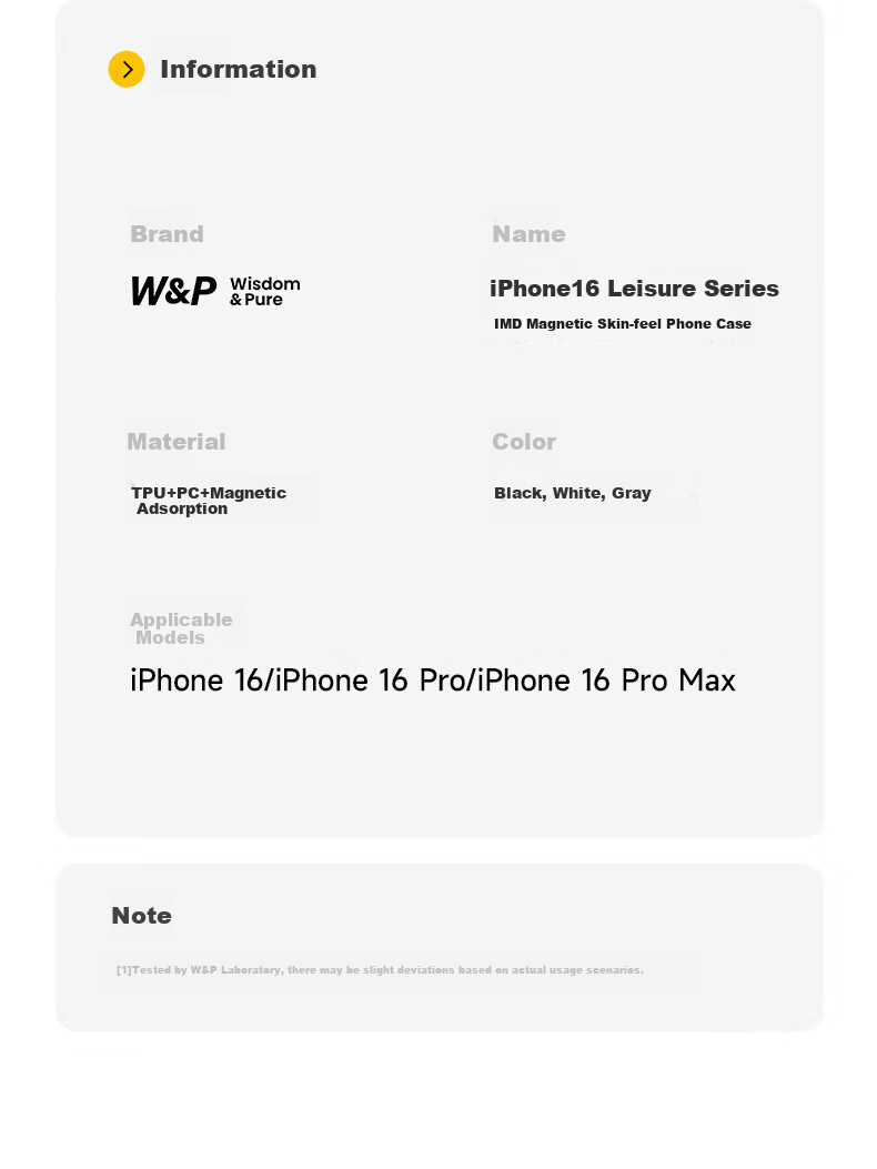 **Note:** Developed by W&P, the Wisdom iPhone16 Leisure Series &Pure IMD Magnetic Absorption Phone Case offers a blend of style, protection, and functionality for iPhone16 series models.