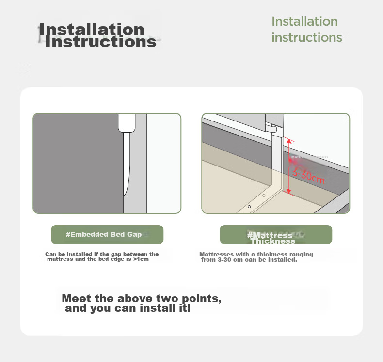 **Installation Instructions:** Suitable for mattress thickness of 3-30cm, fits gaps >1cm between mattress and bed frame