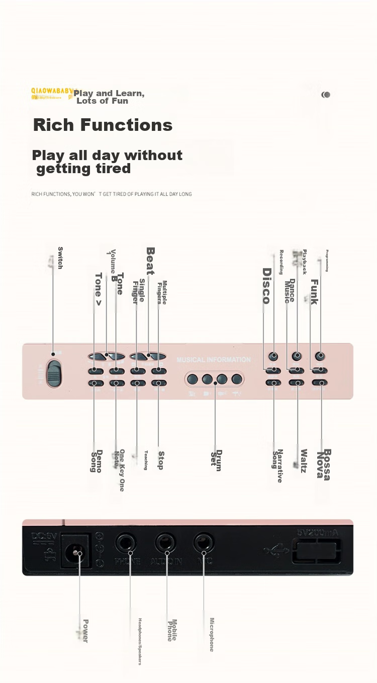 The QIAO WA BAO BEI Musical Electronic Keyboard is designed to provide fun and educational experiences for children, offering a variety of functions to keep them engaged all day long.