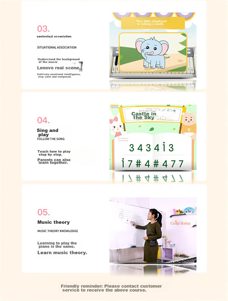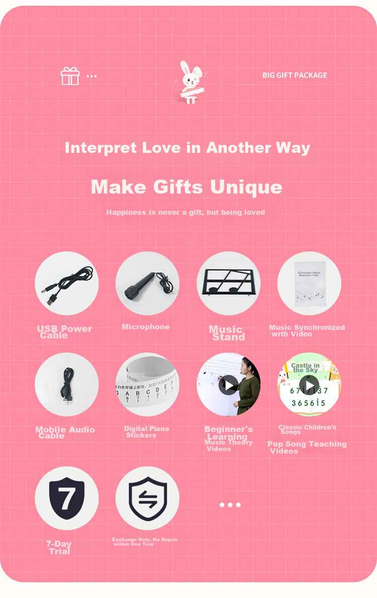 The package includes various accessories such as a music stand, USB power cable, digital piano stickers, and instructional videos for learning classic and popular songs.