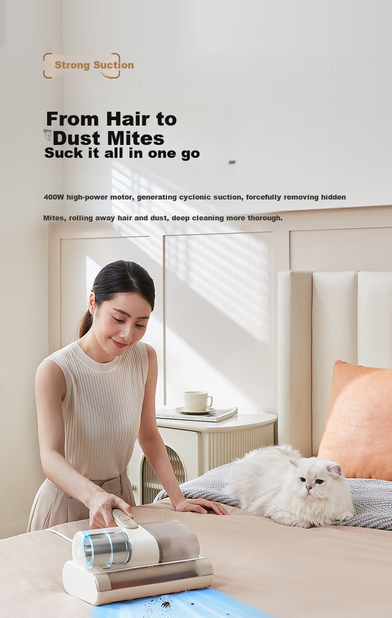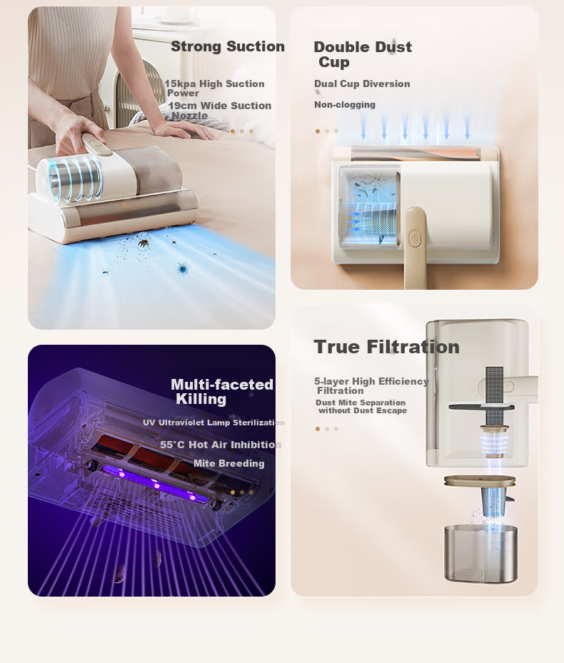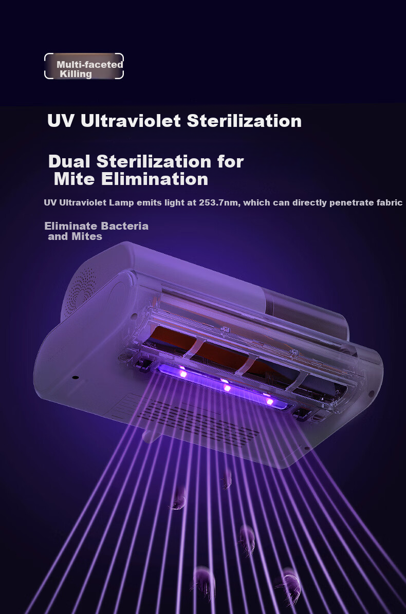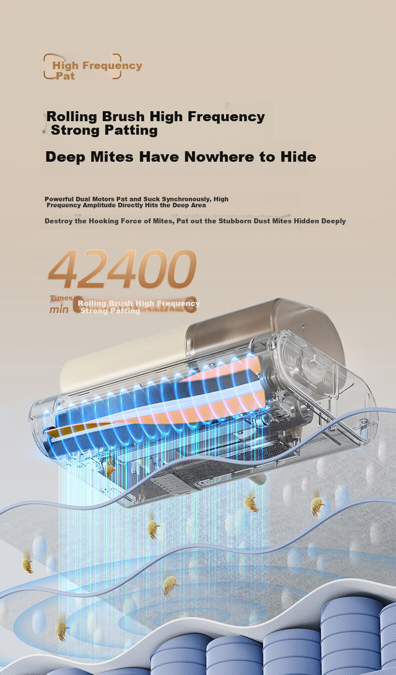 **Additional Features:** Mite control, high-frequency tapping, 42400 times/min tapping frequency, hurricane suction, UV sterilization, 55°C hot air dehumidification