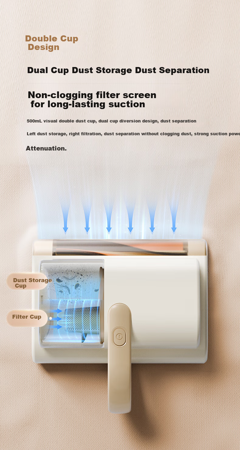 **Double Cup Design:** 500mL visible double dust cup, 15KPa suction power, 19cm wide suction mouth