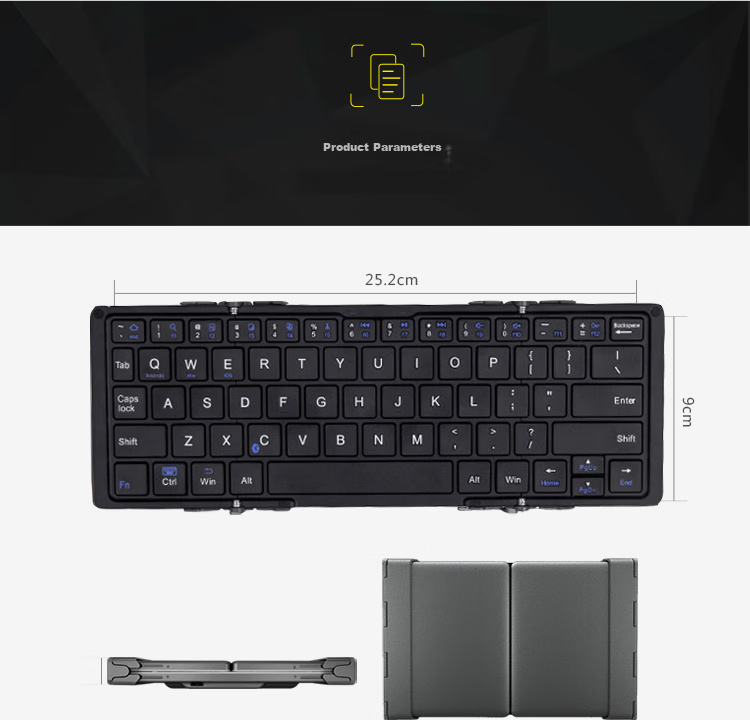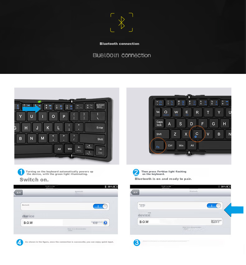 Bluetooth Connection: Automatically powers on when the keyboard is opened, indicated by a green light. Pressing Fn + Bluetooth key initiates pairing, indicated by a flashing blue light. Once connected, the blue light remains steady.