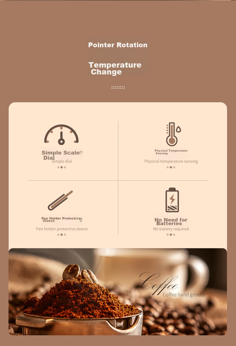 Features: Rotating pointer, temperature change, simple dial, physical temperature sensing, penholder protective sleeve, no battery required