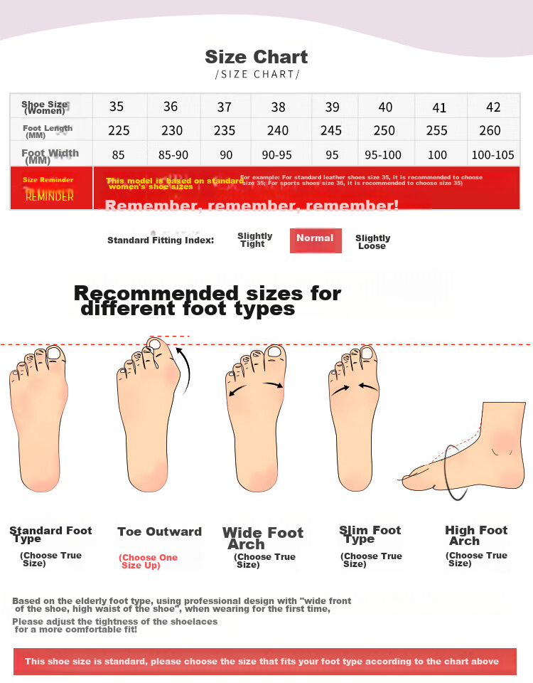 - Toe deformity, wide foot, thin foot, high instep: Choose one size up