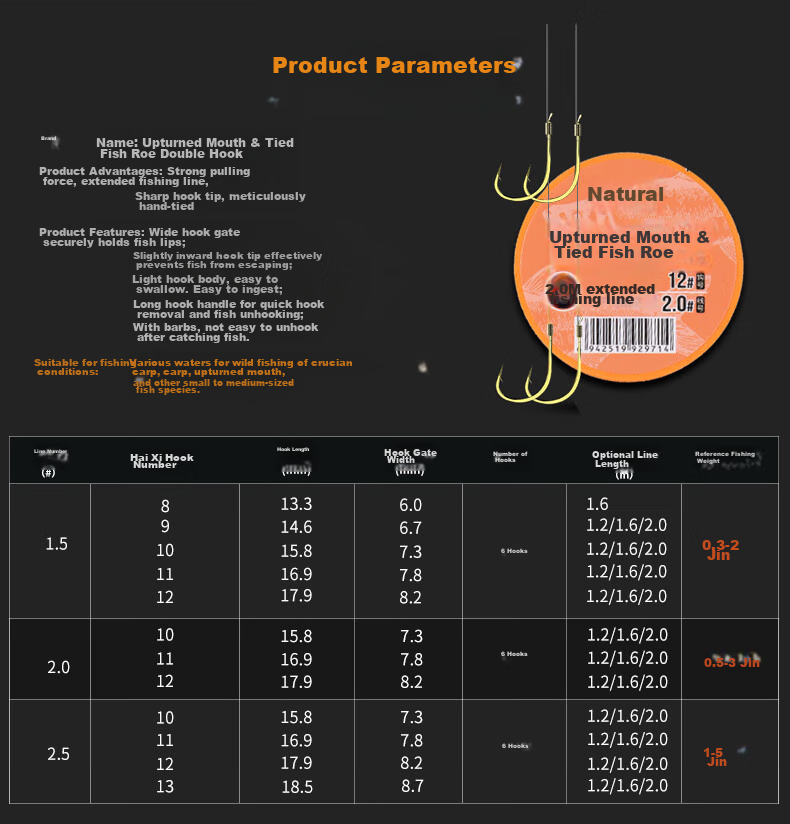 - | Hook Number | Hook Length (mm) | Hook Width (mm) | Number of Hooks | Optional Line Length (m) | Recommended Fishing Weight (kg) |