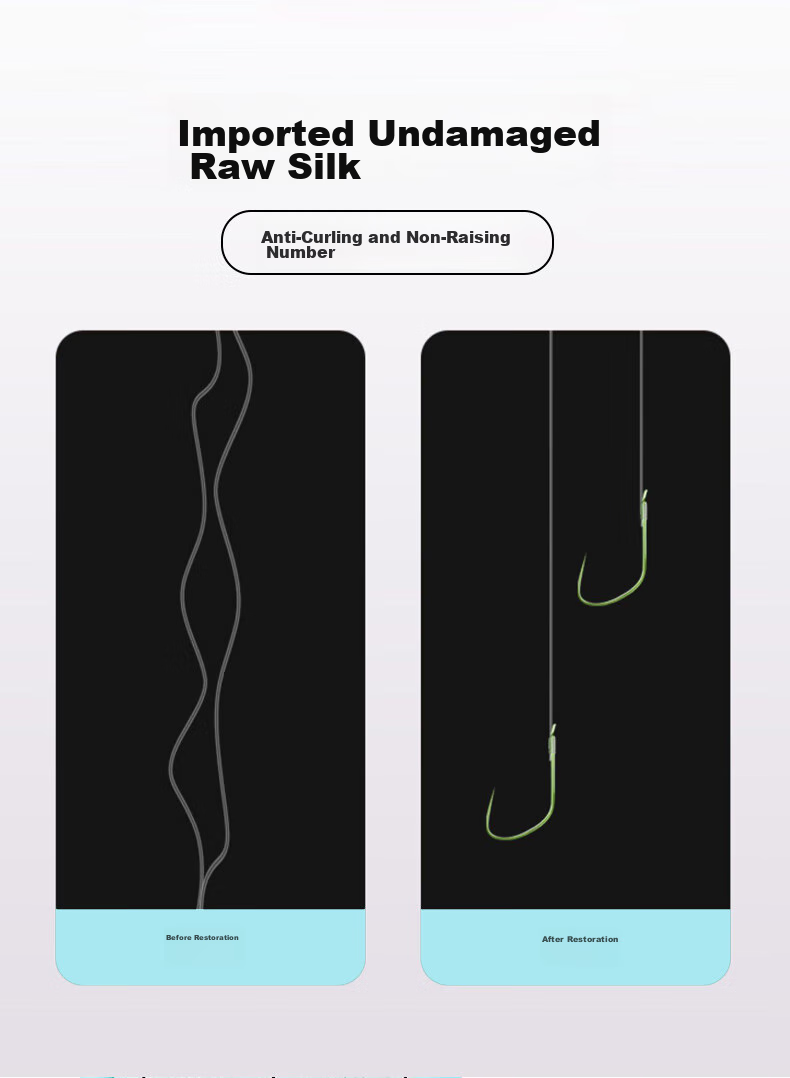 **Design:** Master-level handcrafted tying with precise knotting to prevent hook and line damage, 8-loop internal tying method for secure and even line tying, 30° bend in hook handle to prevent repeated friction, corrosion-resistant material for better durability and easier fish hooking