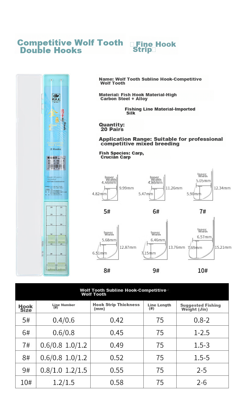*Note: The above hook type is for testing purposes only and may not represent any specific hook type. Please refer to the actual hook type for accuracy. The double hook is handcrafted with care to protect the hook handle and maintain line strength. Before use, please tighten the fishing hook slowly to achieve maximum strength and prevent hook detachment.*