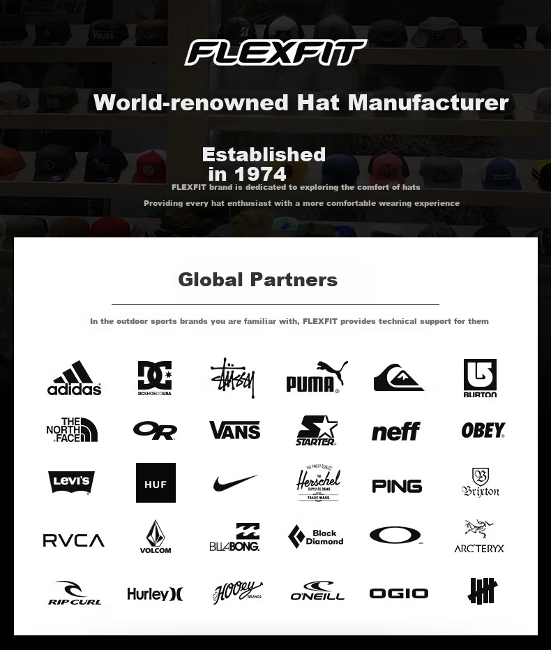 **Description:** FLEXFIT is a globally renowned hat manufacturer dedicated to exploring hat comfort, providing a comfortable wearing experience for hat enthusiasts. FLEXFIT collaborates with various outdoor sports brands such as adidas, BURTON, THE NORTH FACE, VANS, neff, OBEY, THE NORTH FACE, Levi's, HUF, PING, RVCA, Billabong, Diamond, VOLCOM, ARC'TERYX, Hurley, O'NEILL, OGIO, RIP CURL, and more.