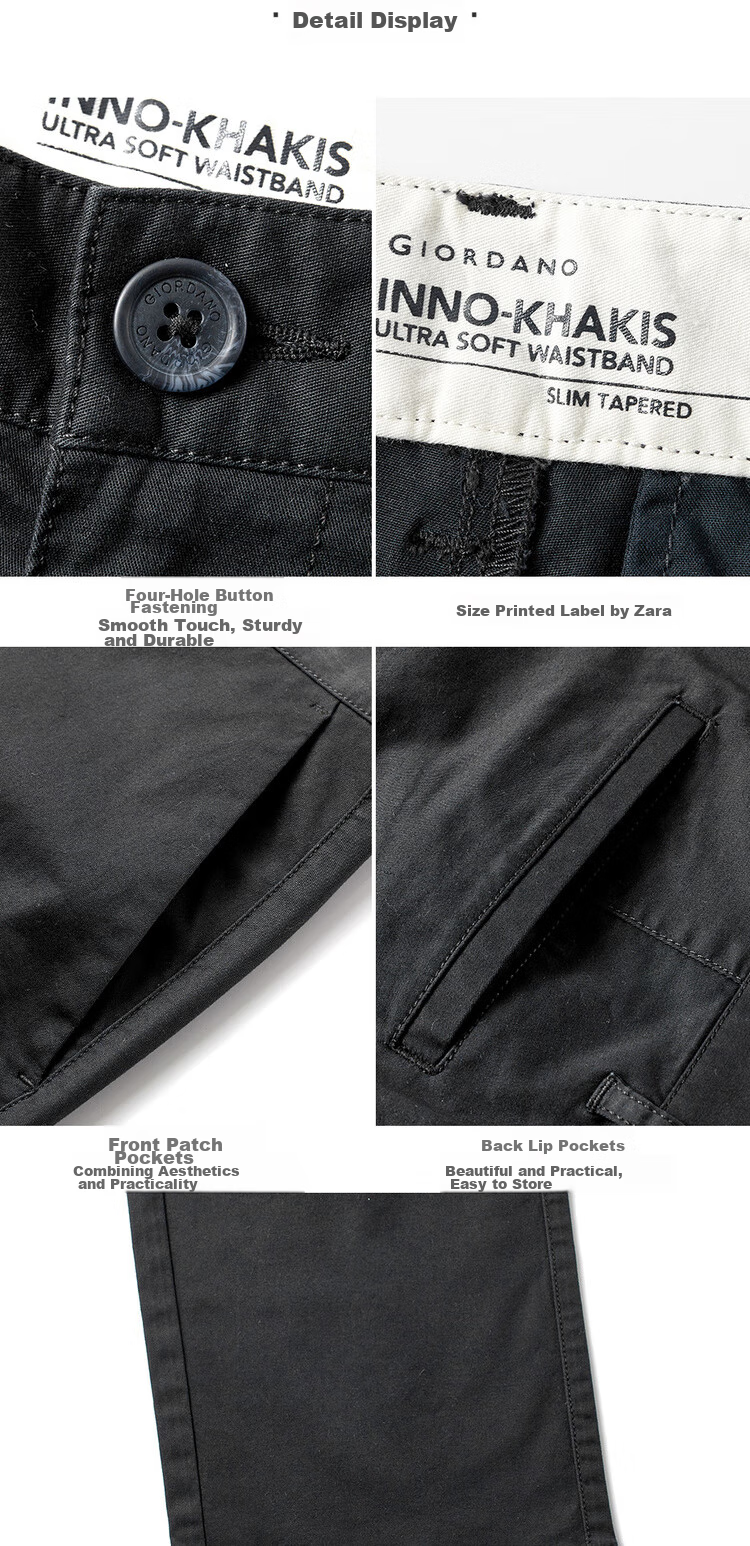 Details: Giordano logo print, Ultra Soft Waistband, Slim Tapered design, Four-hole button closure