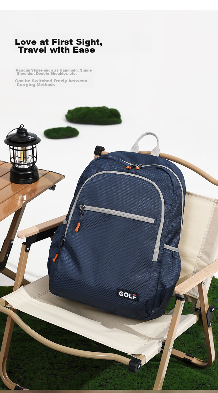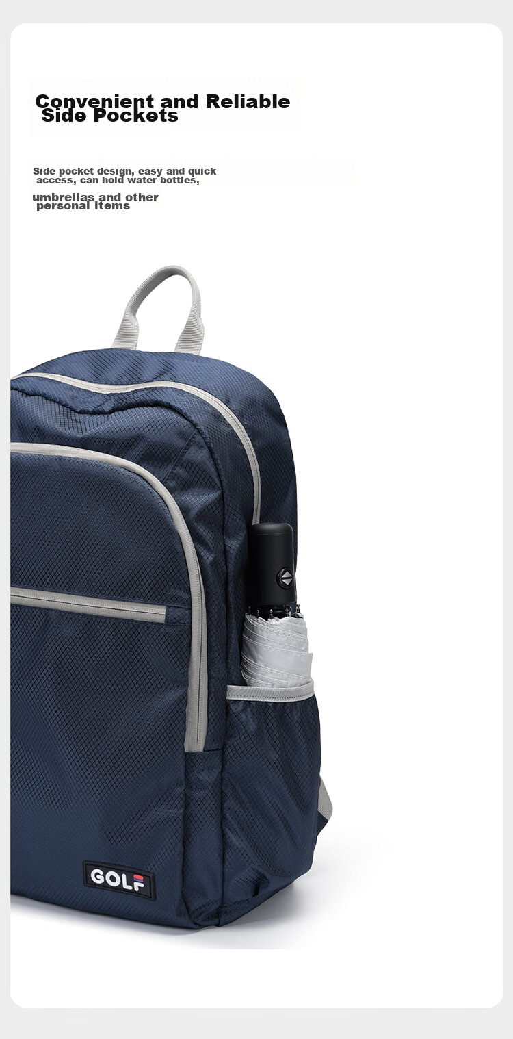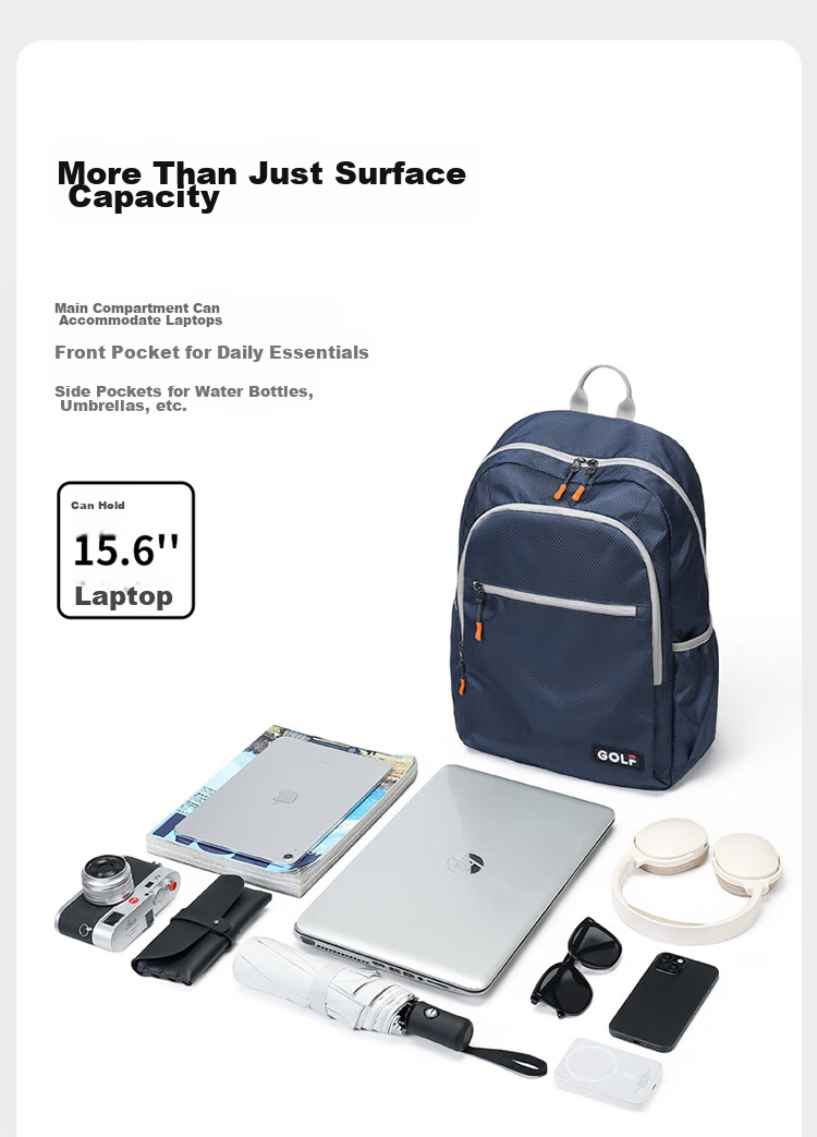 Weight: 0.27kg, GOLF. Spacious design with multiple compartments for organized storage, suitable for commuting or outdoor activities. Each item has a designated space for orderly storage, including zippered pockets, laptop pockets, main compartment, front zippered pockets X2, side pockets X2.