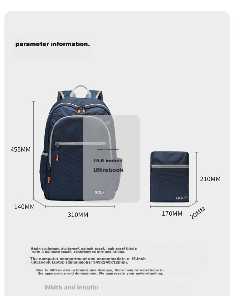 Dimensions: 455MM, can accommodate a 15.6-inch laptop, 210MM, GOLF, GOLr, 140MM, 310MM, 170MM, 20MM, *The main compartment can accommodate a 15.6-inch laptop (specifications: 380x260x30mm), *The laptop compartment can accommodate a 15-inch laptop (specifications: 349x240x12mm), due to different brands and designs, there may be differences in appearance dimensions, please understand. [Note] Due to manual measurement, there may be a 0-30mm error, which is normal, please refer to the actual product for specific details!