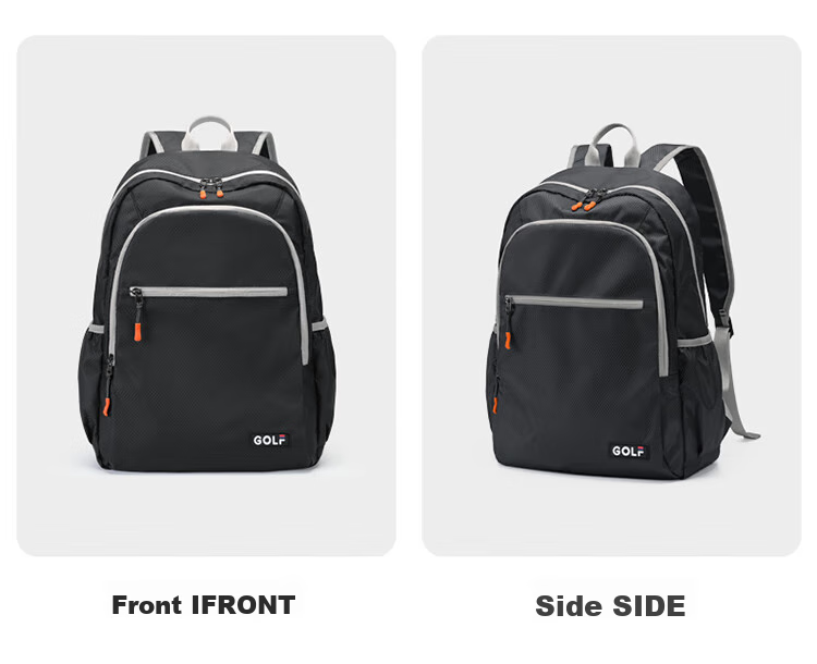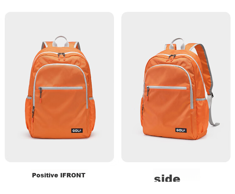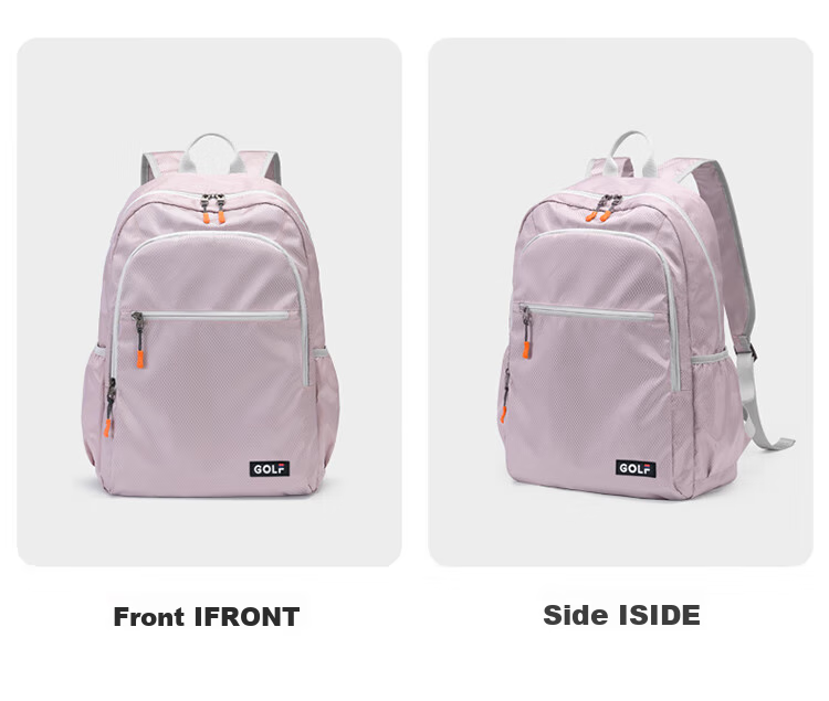 Capacity: The main compartment can accommodate a laptop, front pocket for daily essentials, side pockets for water bottles and umbrellas, can fit a 15.6'' laptop, GOLF. Front zippered pocket①, front zippered pocket②.