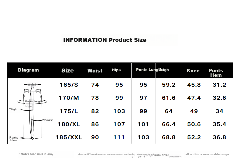 - 185/XXL: Waist 96cm, Hip 111cm, Length 103cm, Thigh 68.8cm, Knee 52.2cm, Leg Opening 36.8cm