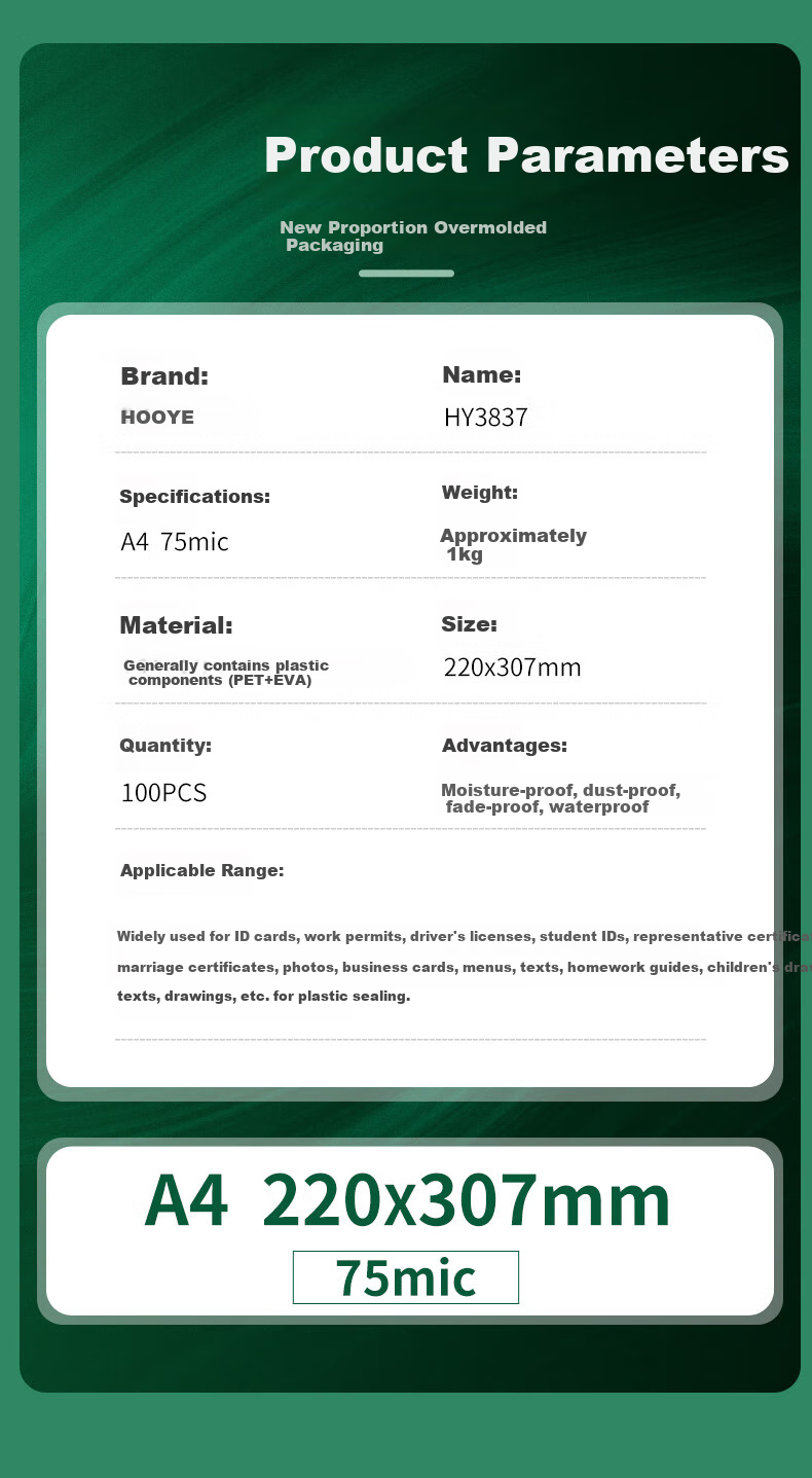 Application: Suitable for laminating ID cards, work permits, driver's licenses, student IDs, marriage certificates, photos, business cards, menus, documents, children's drawings, etc.