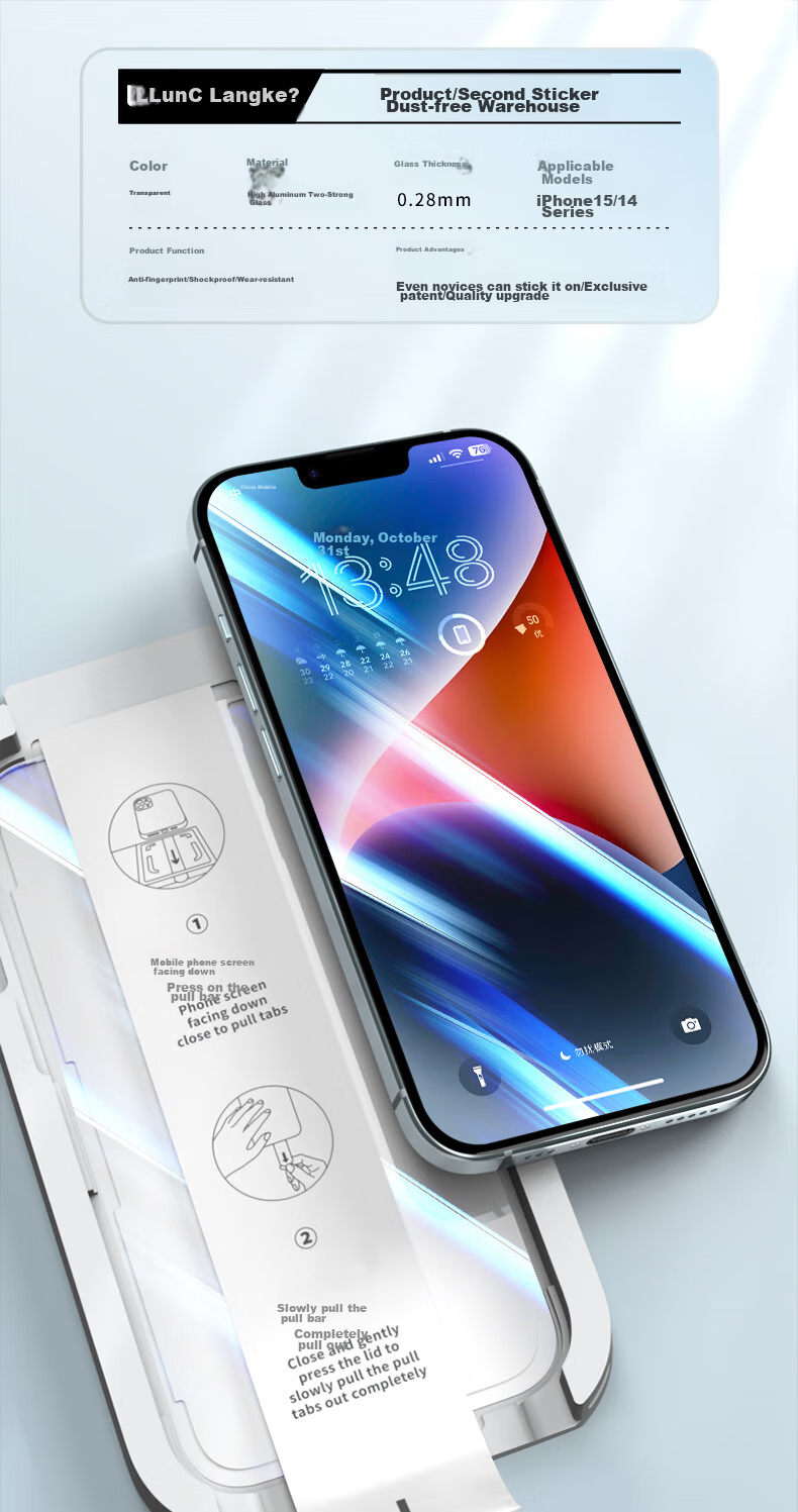 **Additional Information:** Langke is a brand that promises a 7-day, 15-day, and 30-day return or compensation policy for unsatisfactory results. Their new Second Paste Dust-free Warehouse ensures zero bubbles and zero dust during application. The product is specifically designed for the iPhone 14 series and features a full-screen coverage with rounded edges for a smooth touch experience. The glass is fingerprint-resistant and scratch-resistant, providing a clear and sensitive touch response. Langke's products are available on their official flagship store on JD.com.