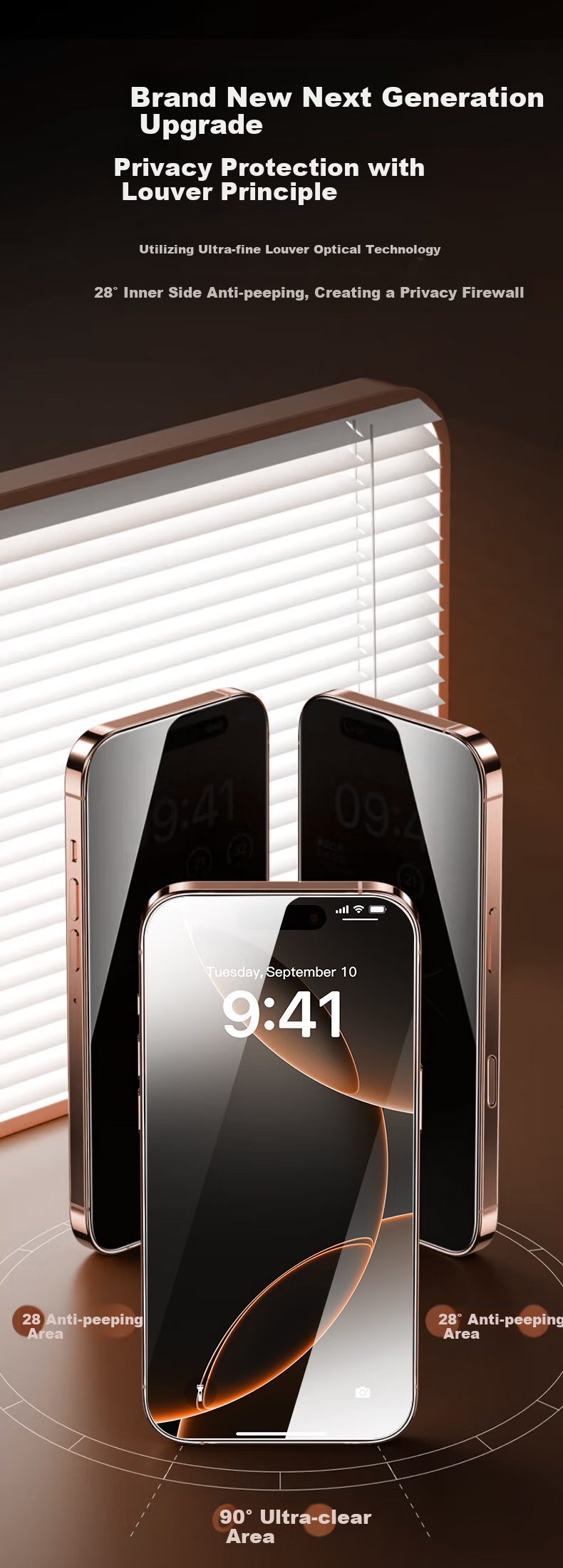 Privacy Technology: Utilizes ultra-fine louvers optical technology with a 28° anti-spy area, creating a privacy firewall