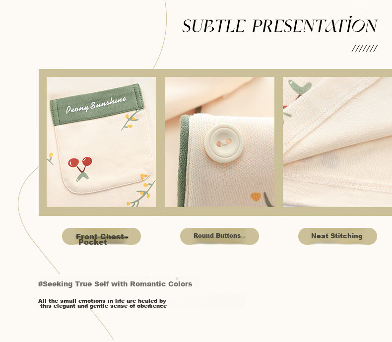 The Peony Sunshine and Cherry designs feature subtle details like front pockets, round buttons, and neat stitching.