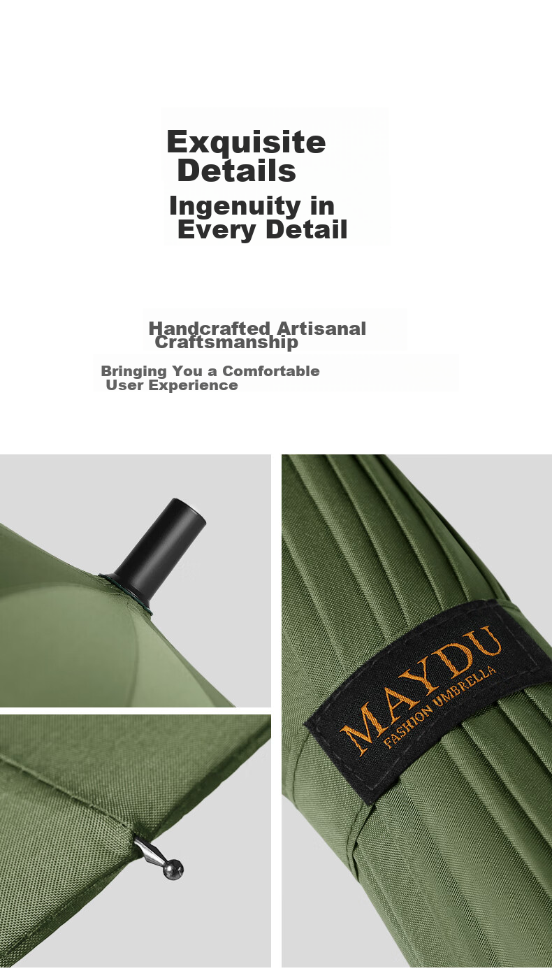 MAYDU umbrellas are meticulously handcrafted with attention to detail, providing a comfortable user experience. Each umbrella is designed to bring a touch of elegance and practicality to your daily life.