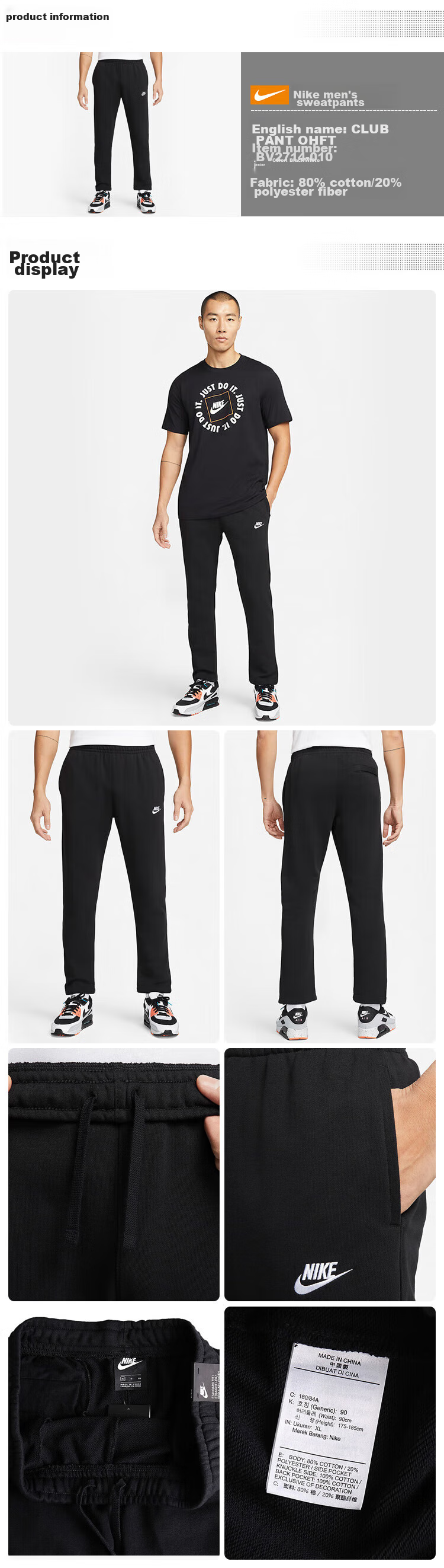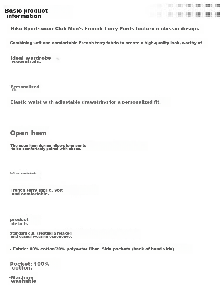 Product description: Nike Sportswear Club Men's French Terry Pants feature a classic design with soft and comfortable French terry fabric, creating a high-quality look that is ideal for your wardrobe. The pants have a personalized fit with an elastic waistband and adjustable drawstring. The open hem design allows for comfortable pairing with shoes. The French terry fabric is soft and comfortable.