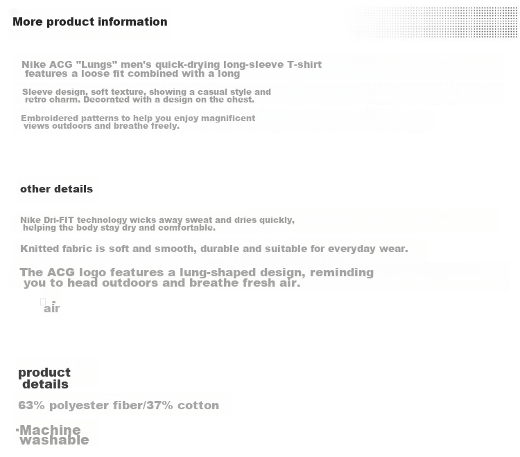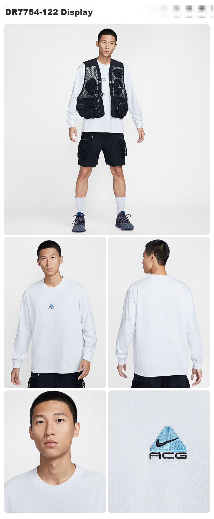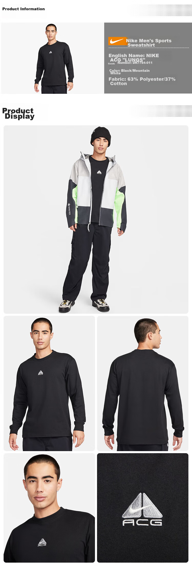 Description: The Nike ACG "Lungs" men's quick-drying long-sleeve T-shirt features a loose fit with a long sleeve design, soft texture, showcasing a casual and retro style. Embroidered pattern on the chest allows you to enjoy magnificent views outdoors and breathe freely.
