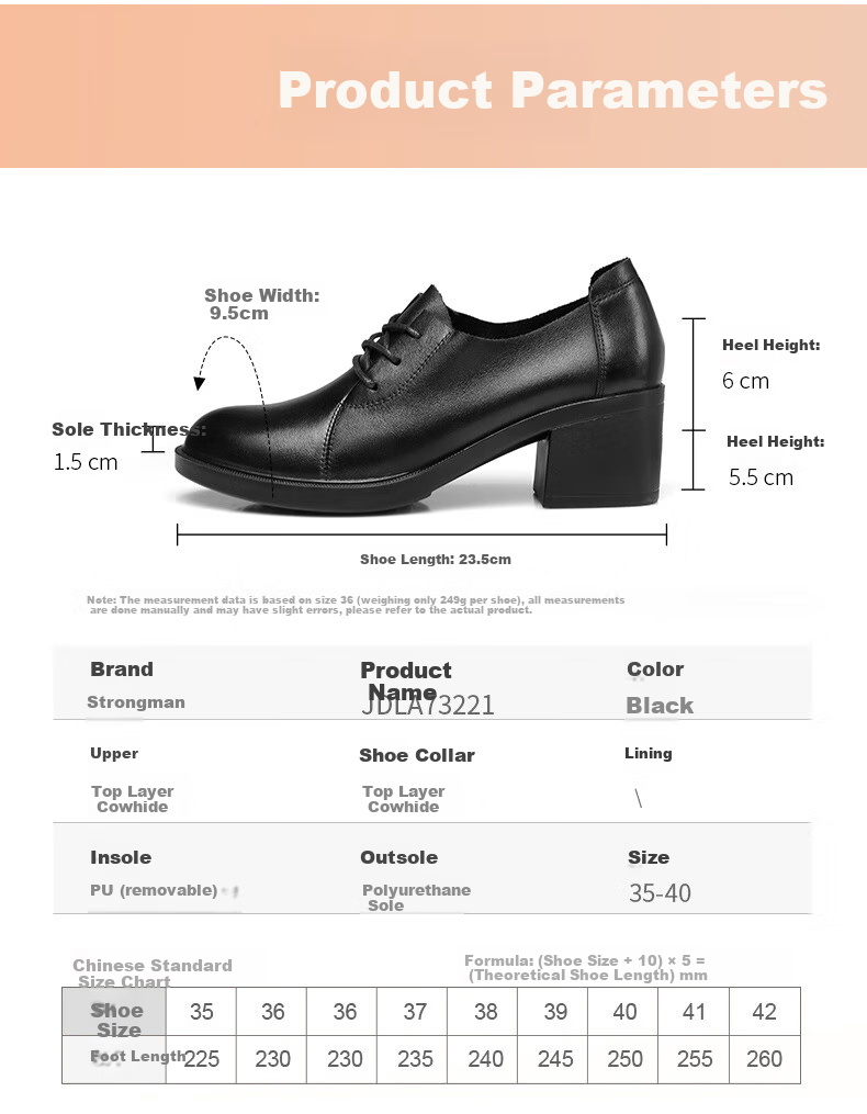 **Size Conversion Formula:** (Shoe size + 10) × 5 = (Theoretical shoe length) mm