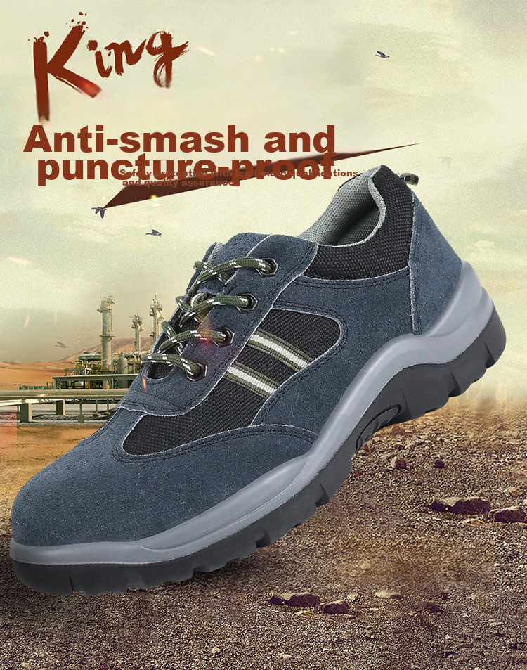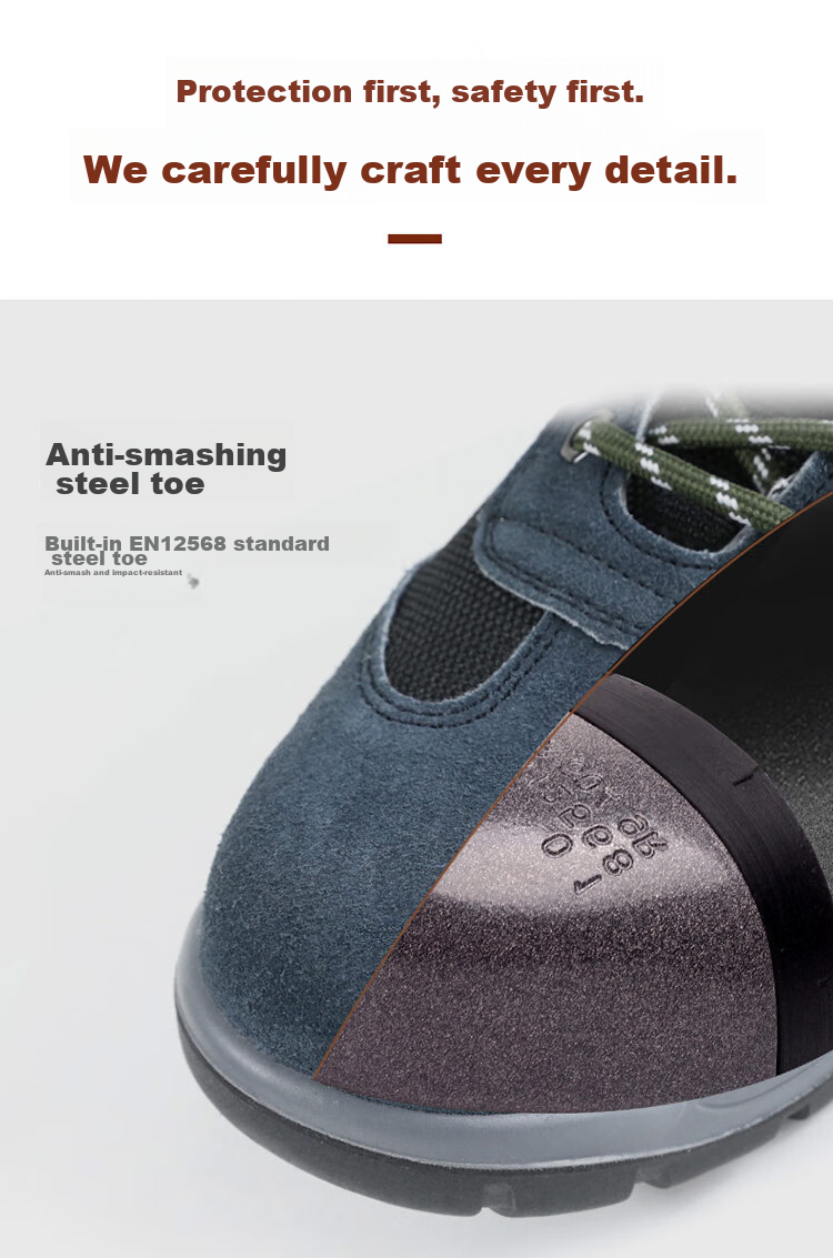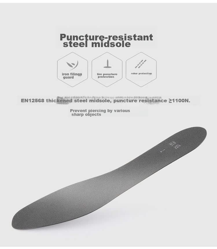 **Safety Features:** Steel toe cap meeting EN12568 standard for smash resistance, thickened steel midsole for puncture resistance (≥1100N), rust and corrosion resistant surface coating, able to withstand 200j impact energy