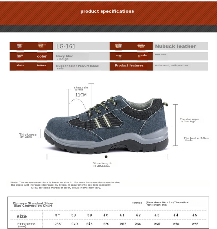 **Features:** Smash-proof, puncture-proof, wide shoe sole (11CM), 7CM high shoe upper, 2CM thickness, 3.5CM thick heel, 29.5CM shoe length