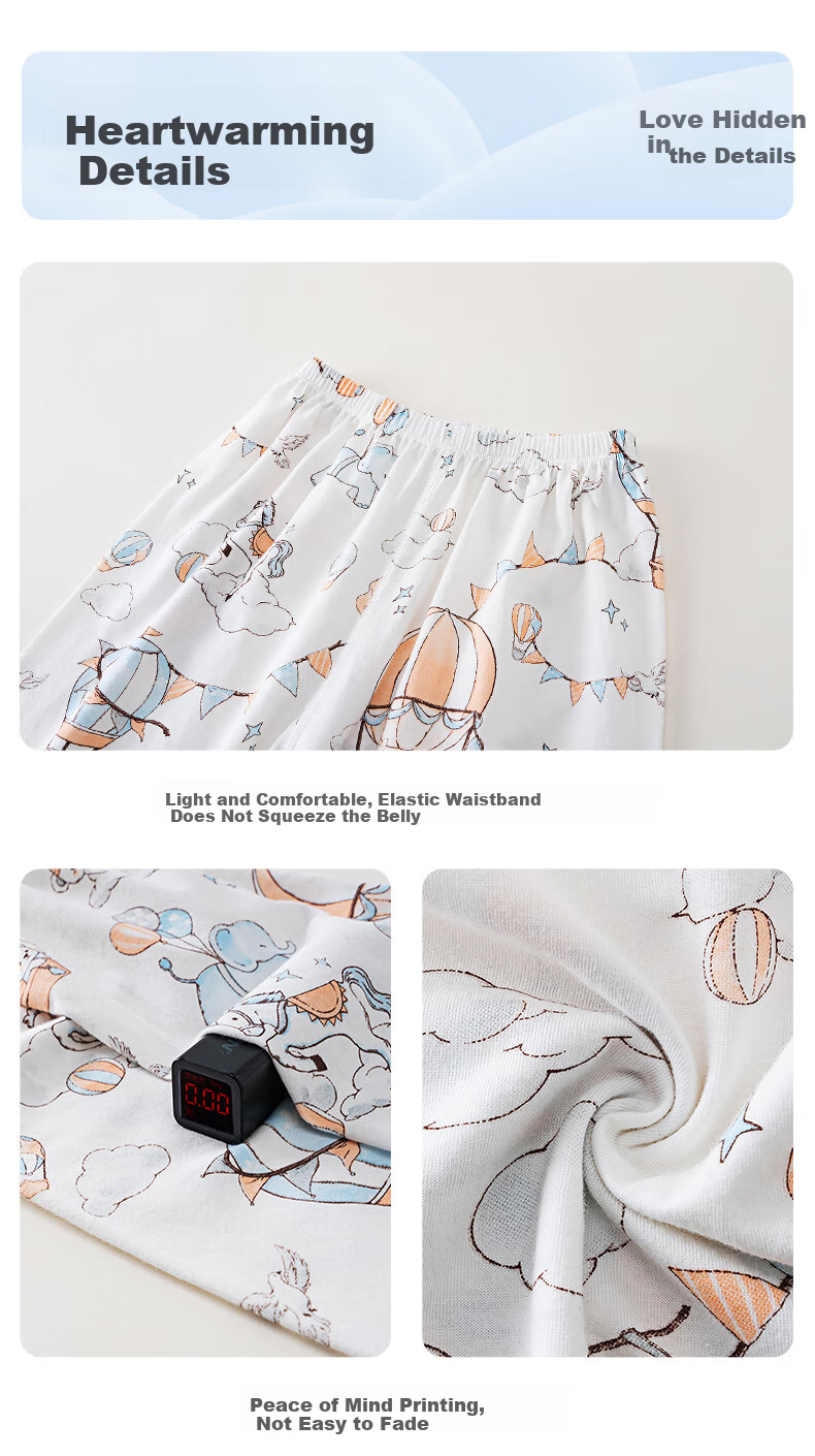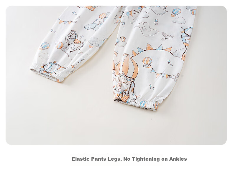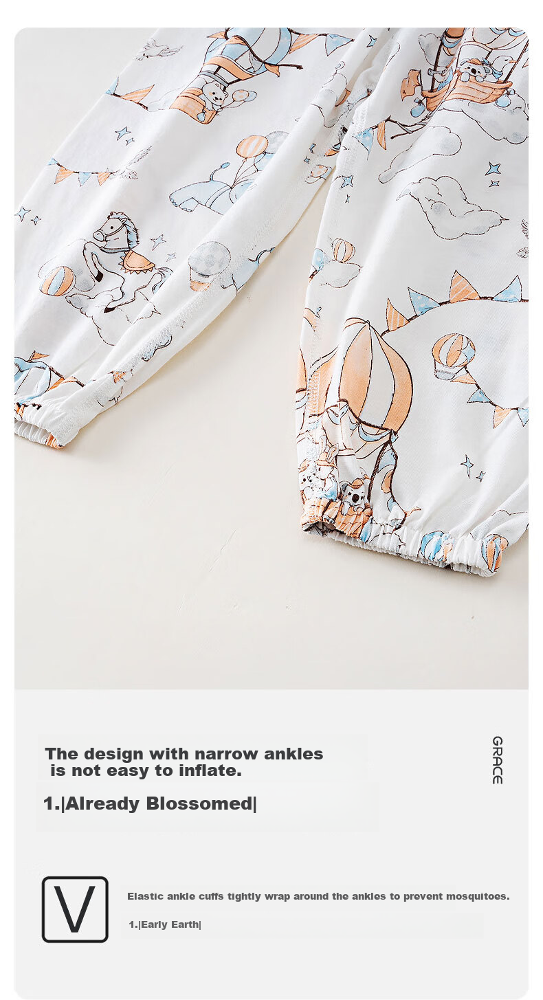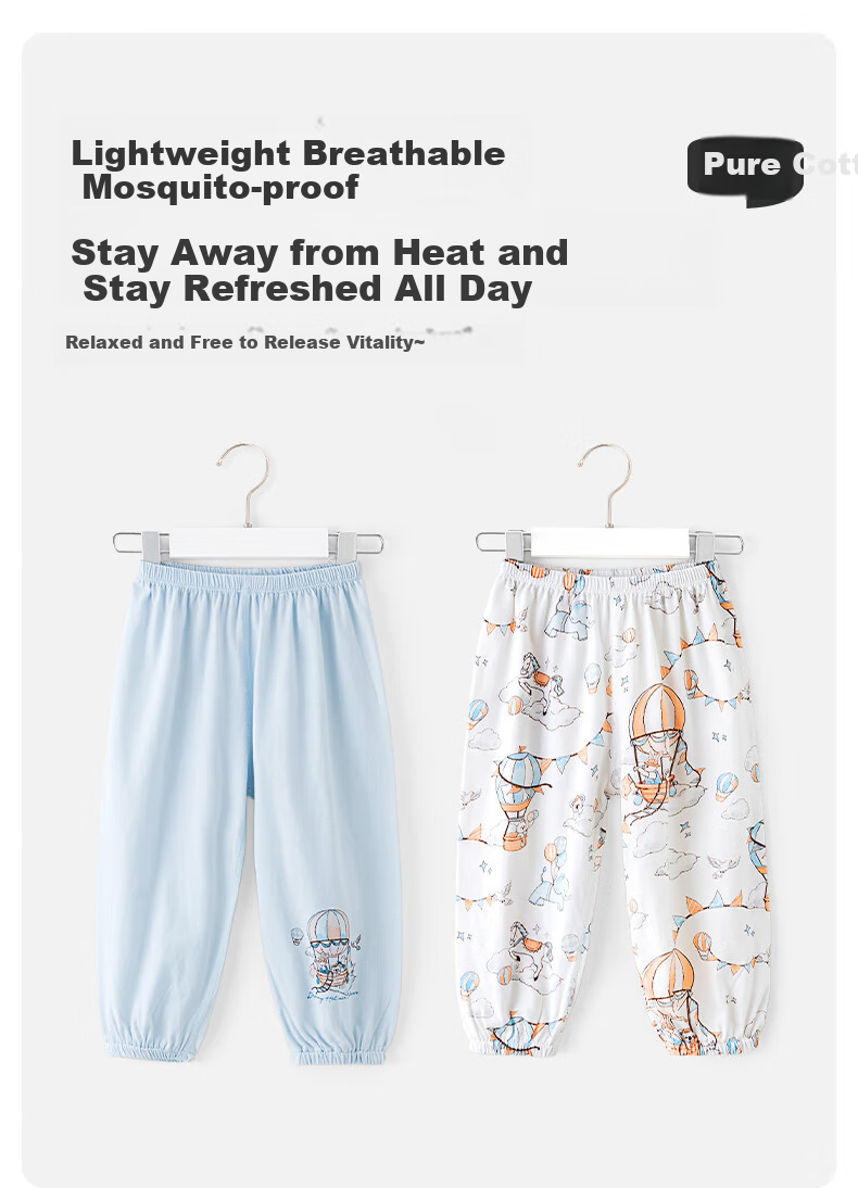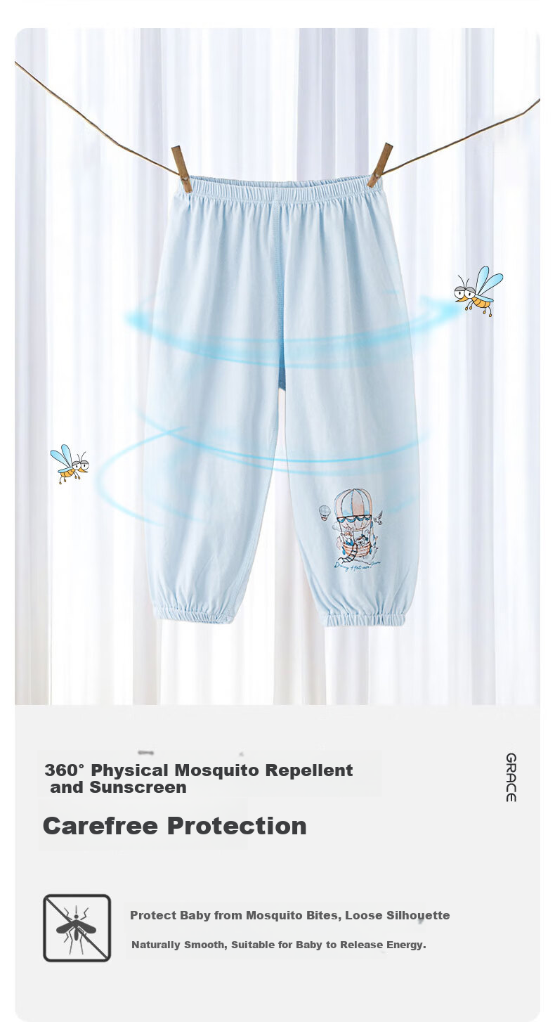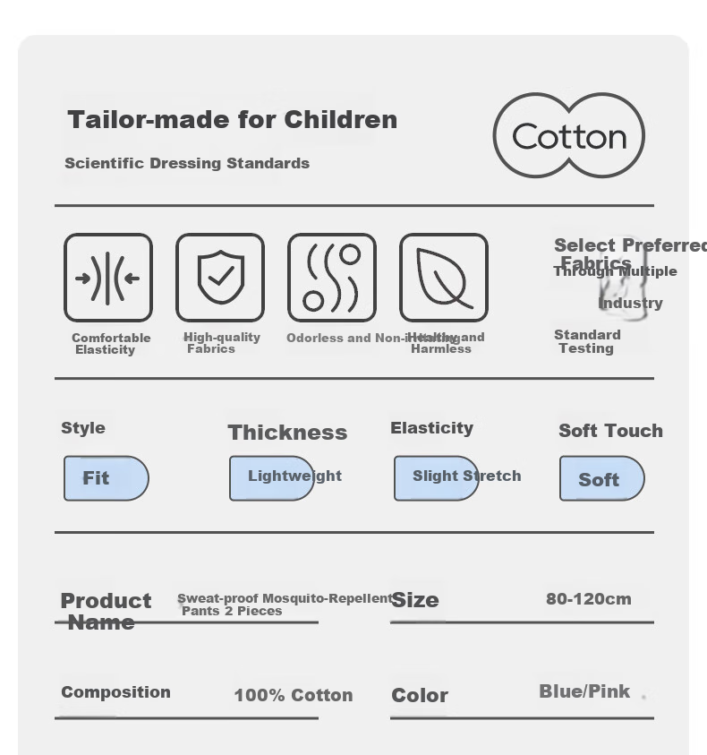 **Description:** Lightweight and breathable mosquito-proof clothing made of pure cotton, keeping children cool and comfortable all day long. Features 7A antibacterial technology for added health protection. Provides 360° physical mosquito and sun protection. Loose fit for freedom of movement. Adorned with whimsical patterns for a visually appealing design. Features ankle cuffs to prevent insects from entering. Elastic waistband for a secure and comfortable fit. Made from high-quality cotton fabric with a soft touch. Available in blue/pink colors.