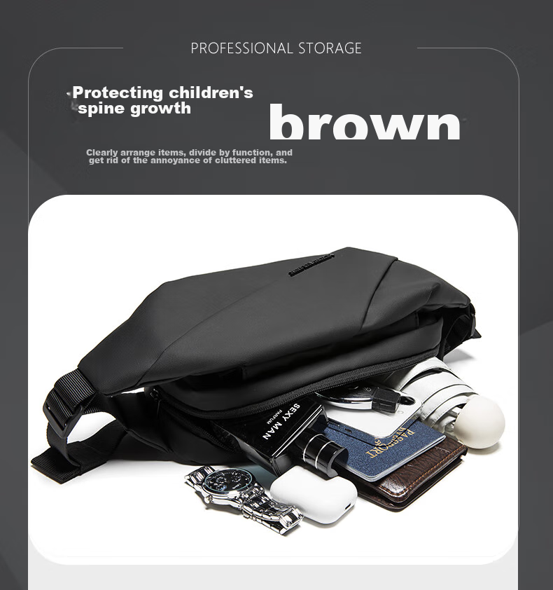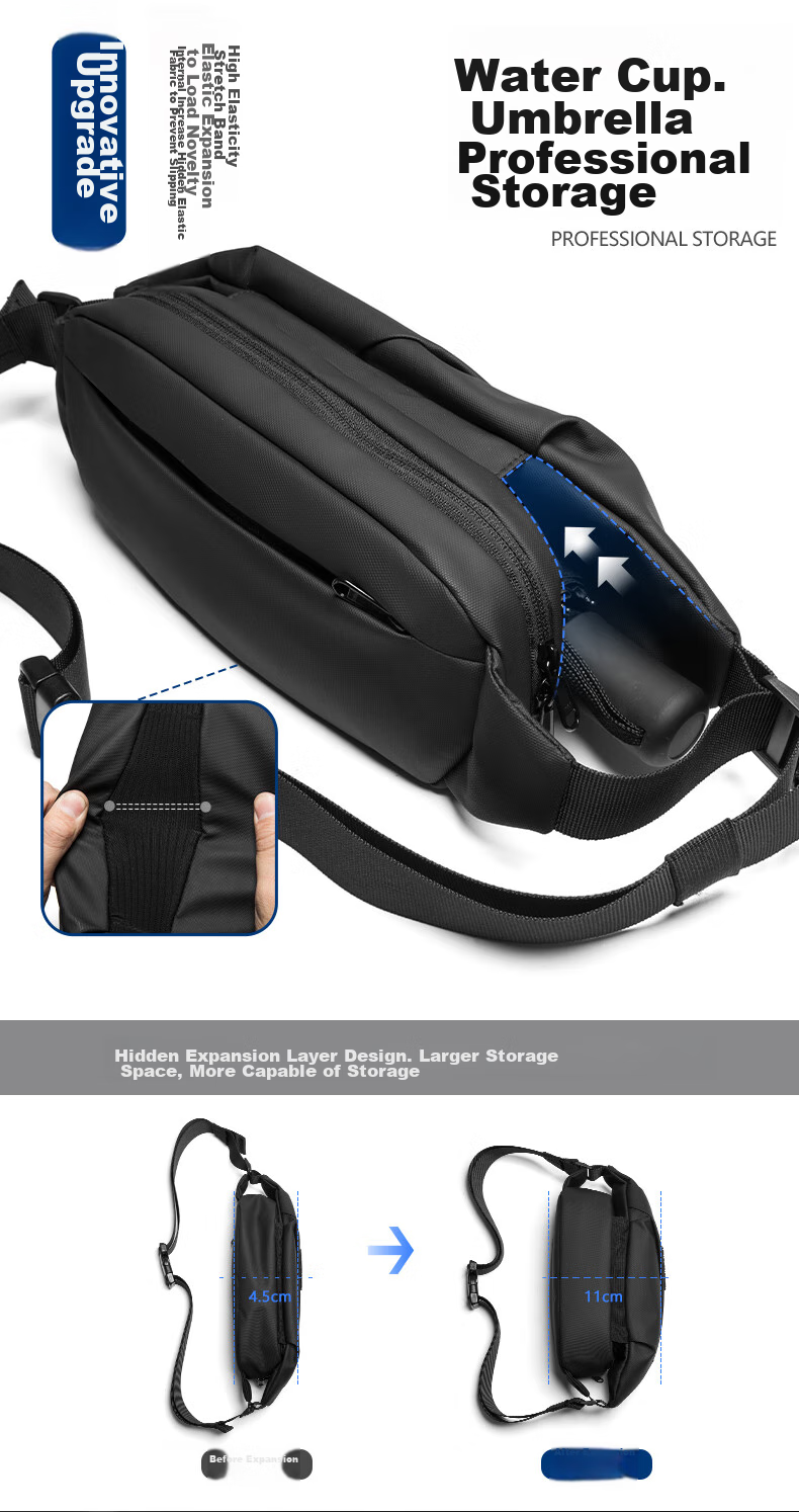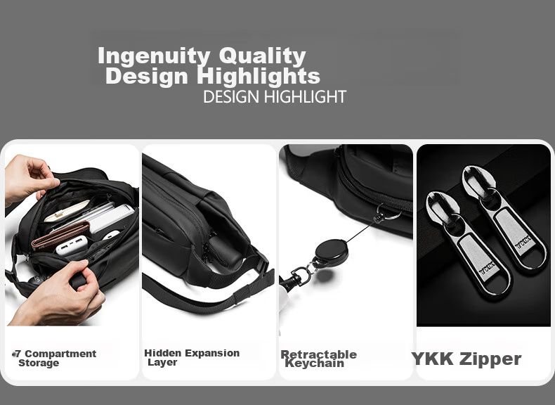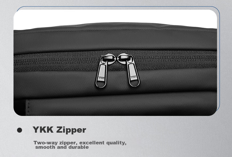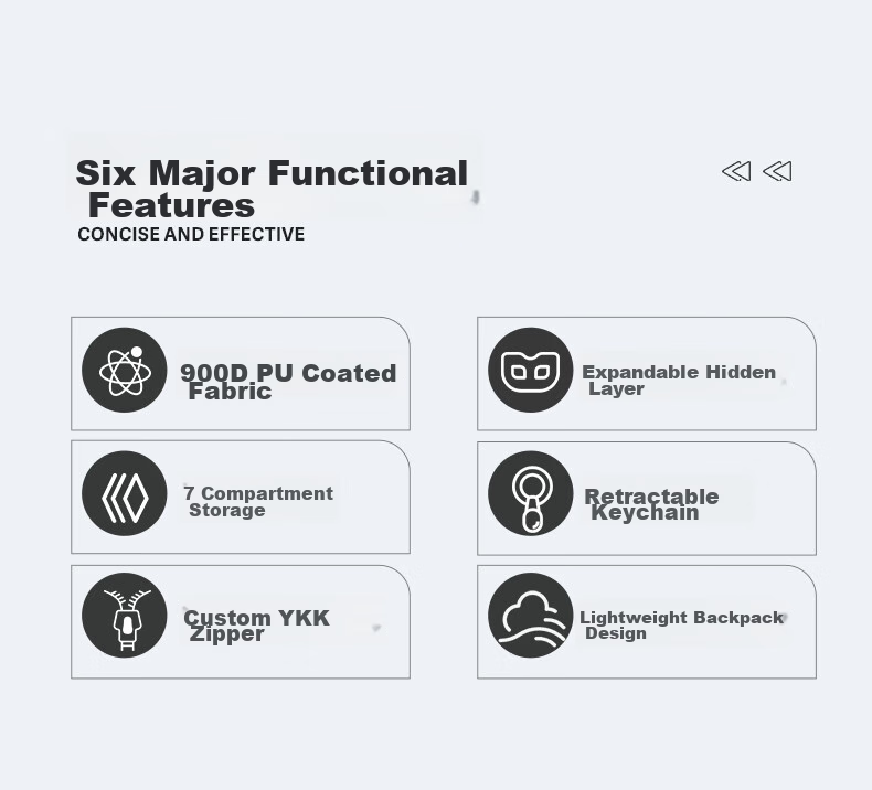 Detail Function: High-quality brand logo, durable YKK zippers, expandable hidden layer, adjustable strap storage