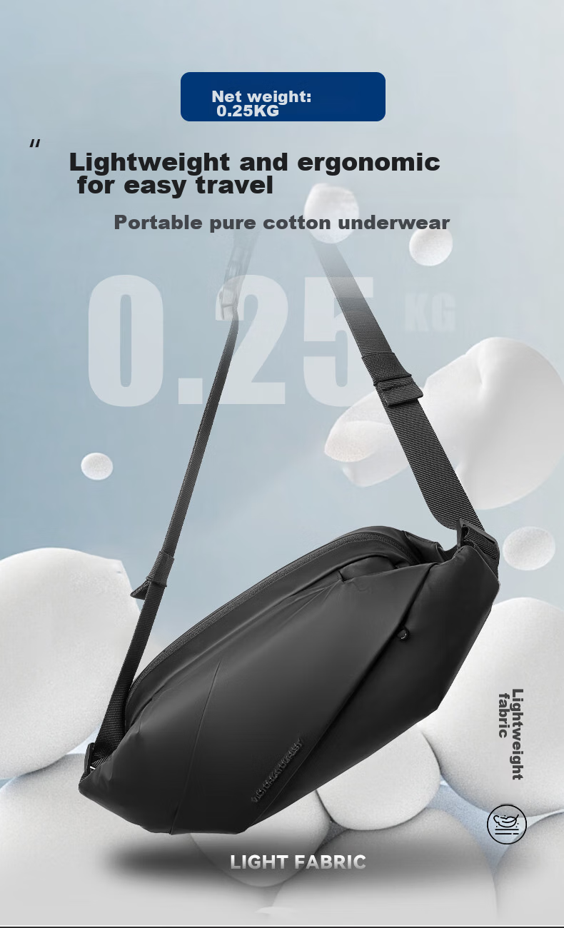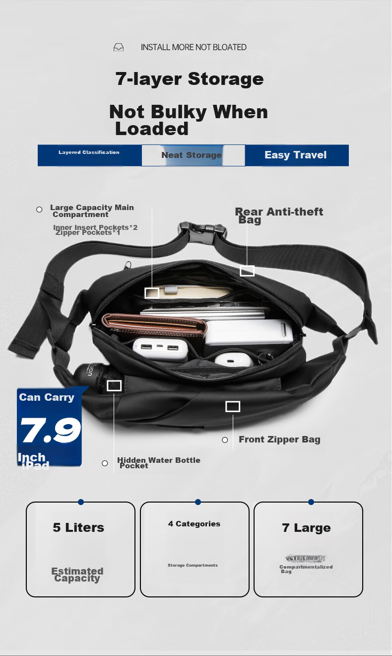 Features: 7 compartments, YKK zippers, expandable hidden layer, key clip, lightweight design