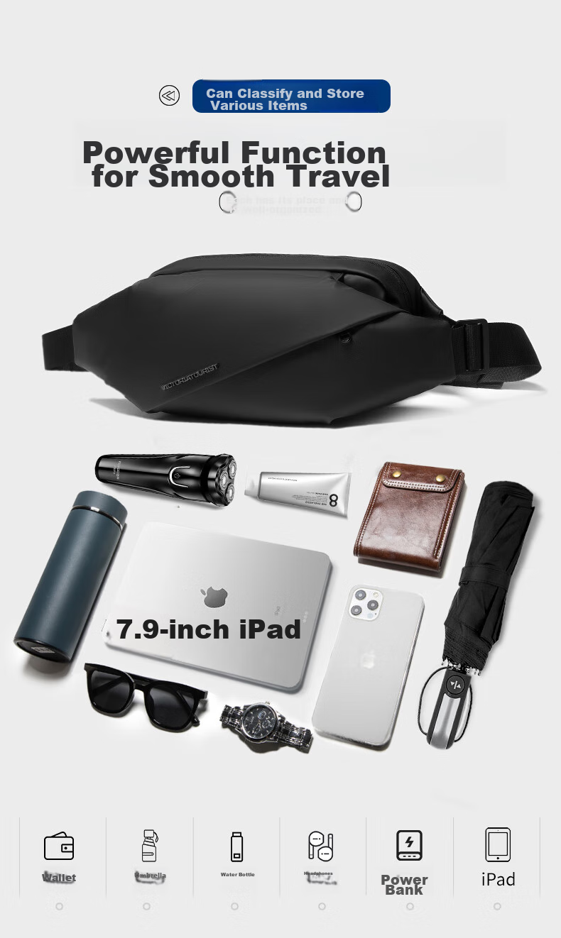 Capacity: 7.9-inch iPad, wallet, umbrella, water bottle, headphones, power bank