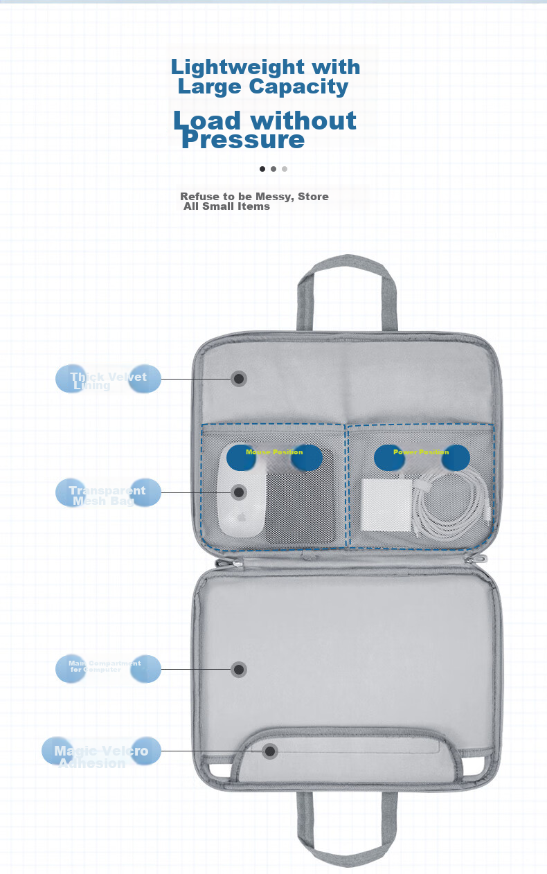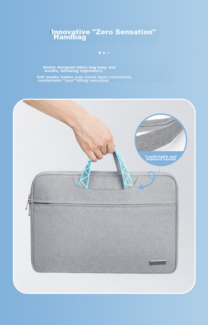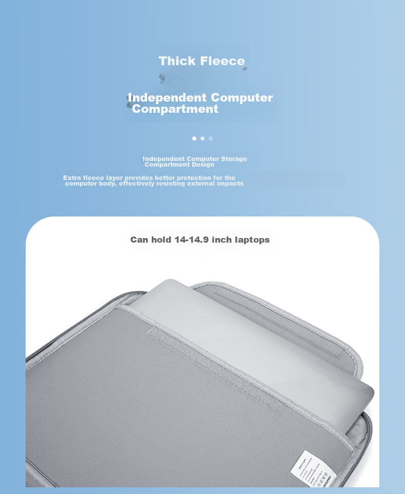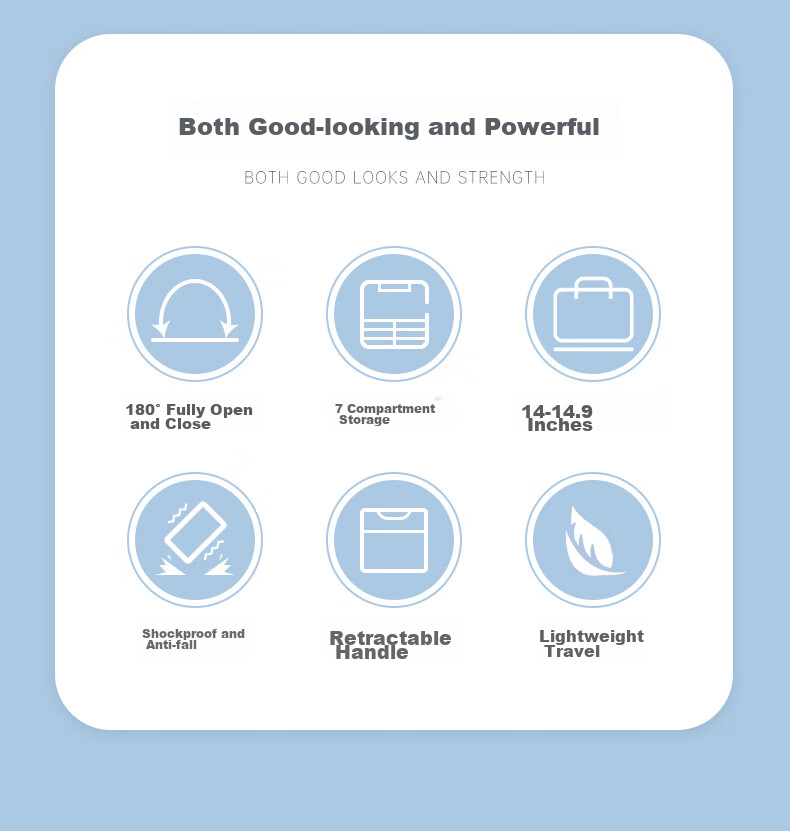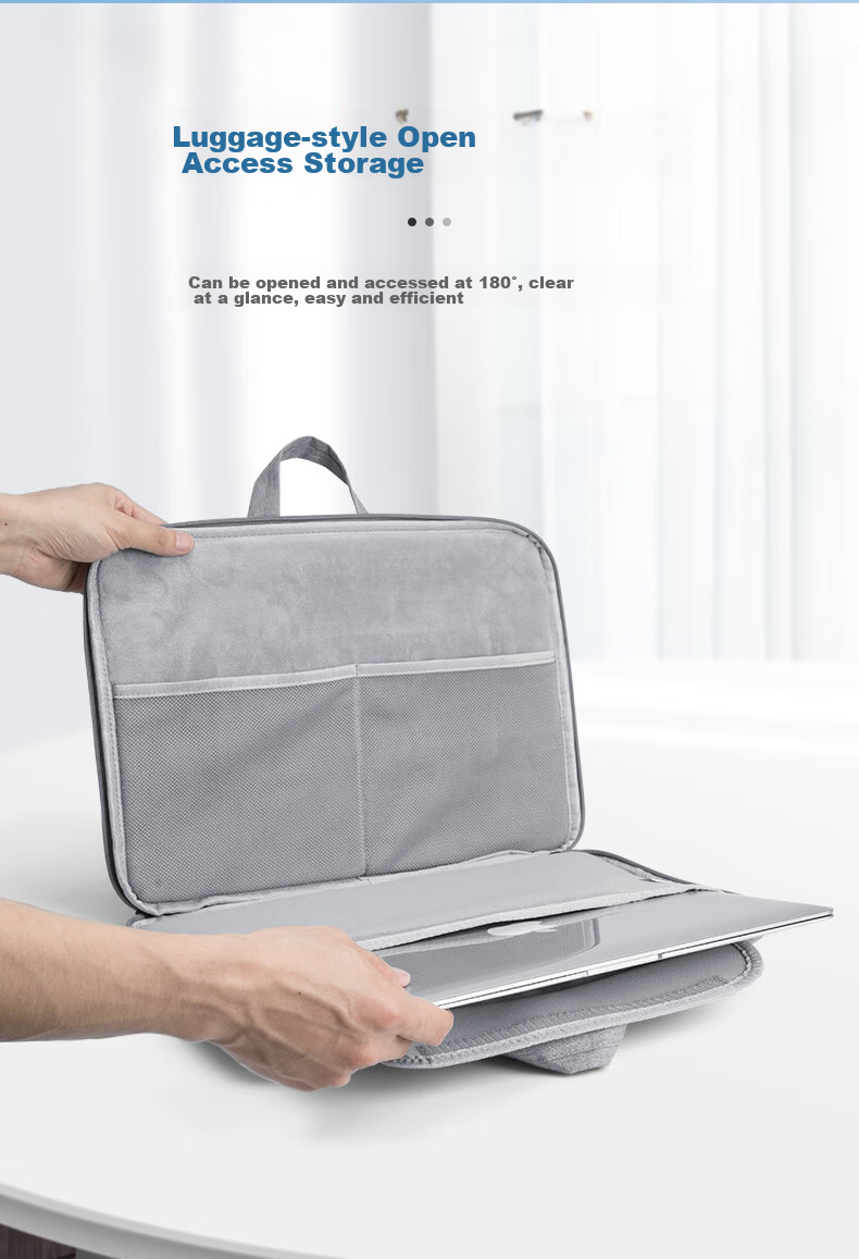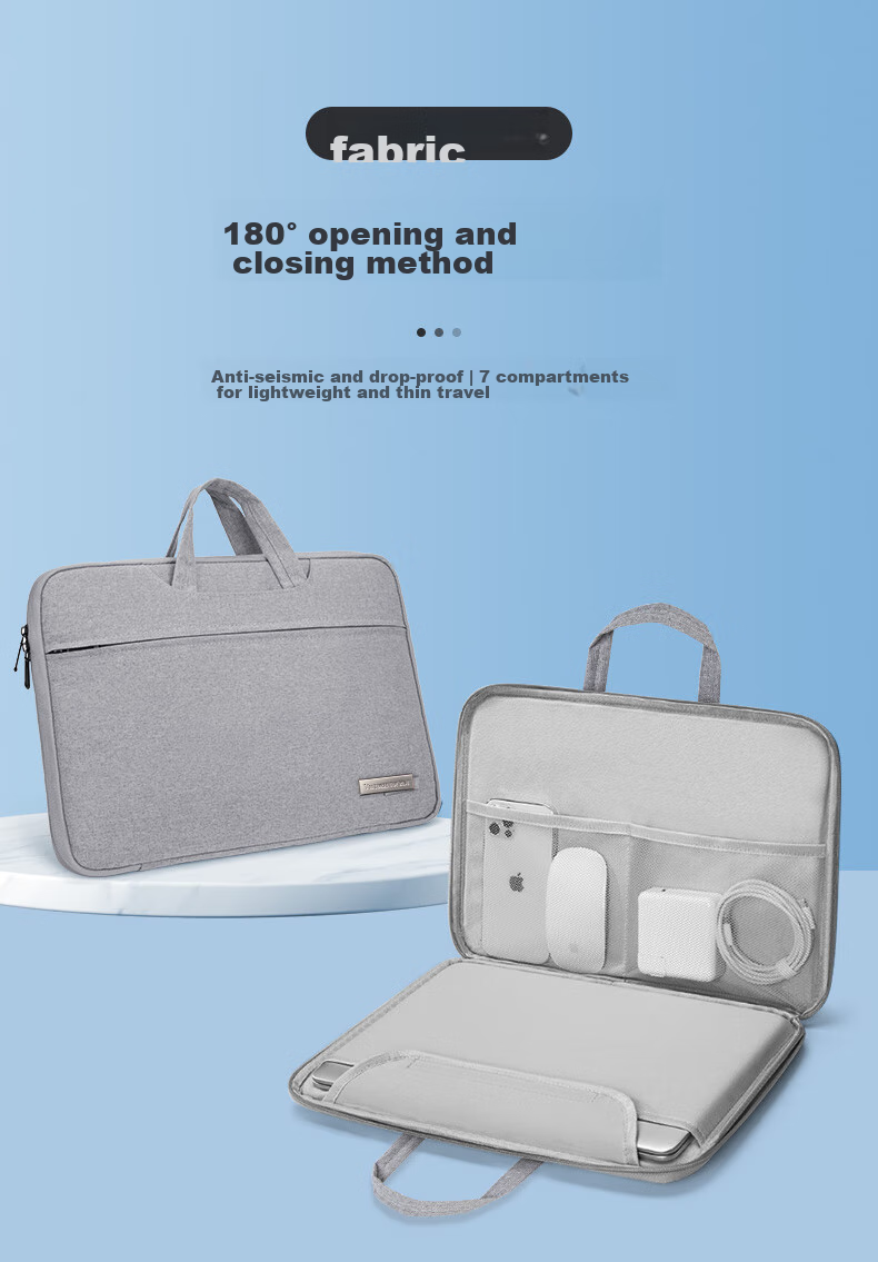 **Features:** 180° fully open design, 7 compartments for organized storage, shockproof and anti-drop, hidden handle, TSA-friendly, water-resistant polyester fabric, multiple layers of protection, innovative "zero sense" handle, versatile usage as a laptop bag, inner bag, or mouse pad