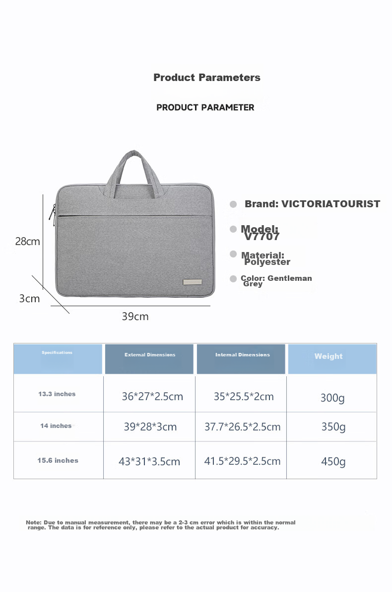 **External Dimensions:** 13.3 inch - 36cm x 27cm x 2.5cm, 14 inch - 39cm x 28cm x 3cm, 15.6 inch - 43cm x 31cm x 3.5cm