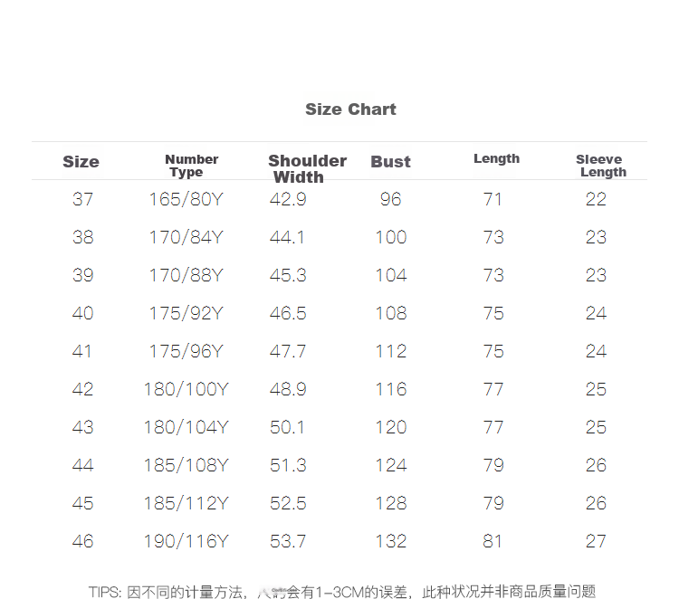 - 43: 180/104Y, Shoulder Width: 50.1cm, Bust: 120cm, Length: 77cm, Sleeve Length: 25cm