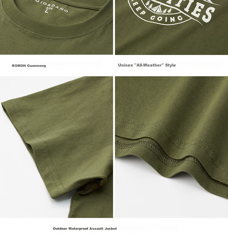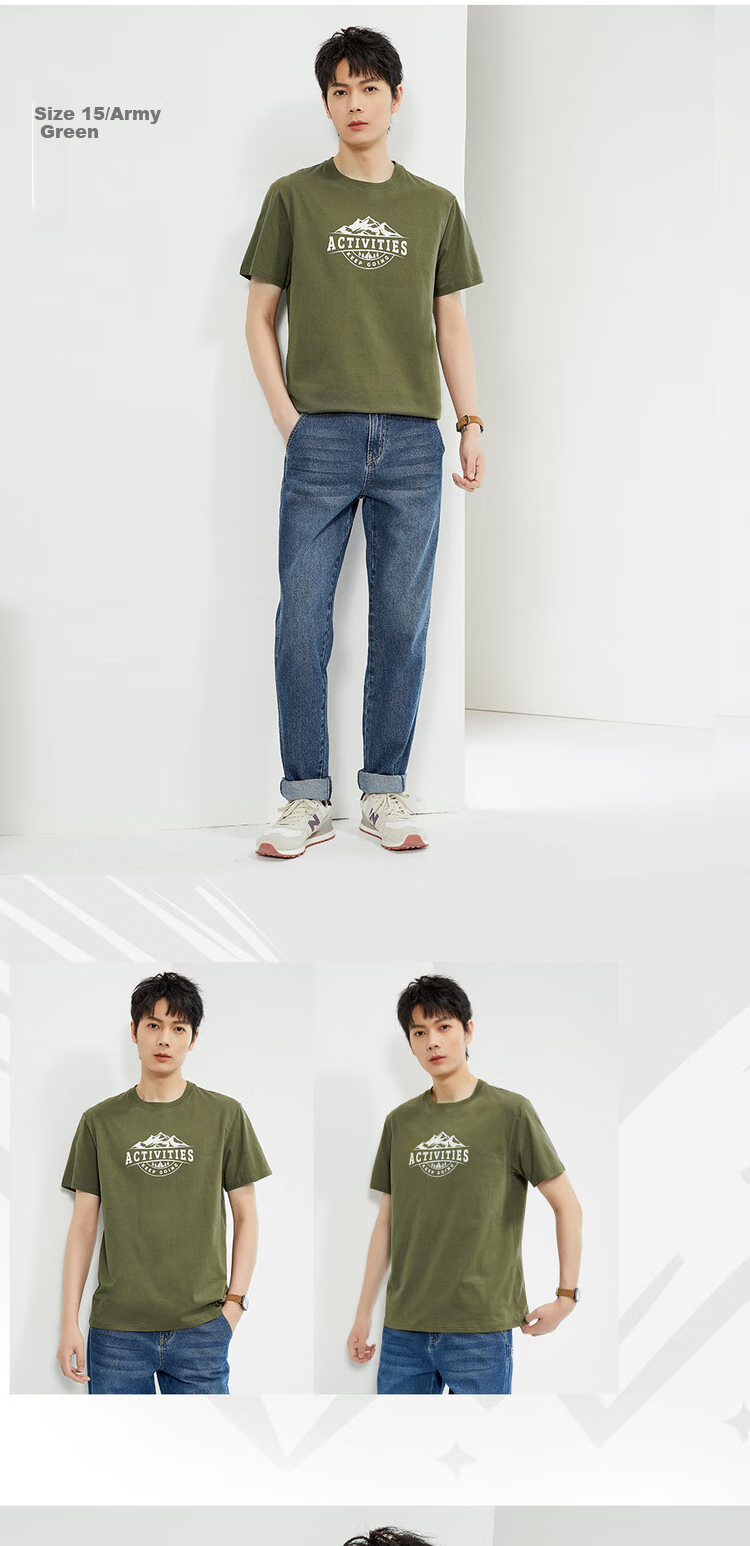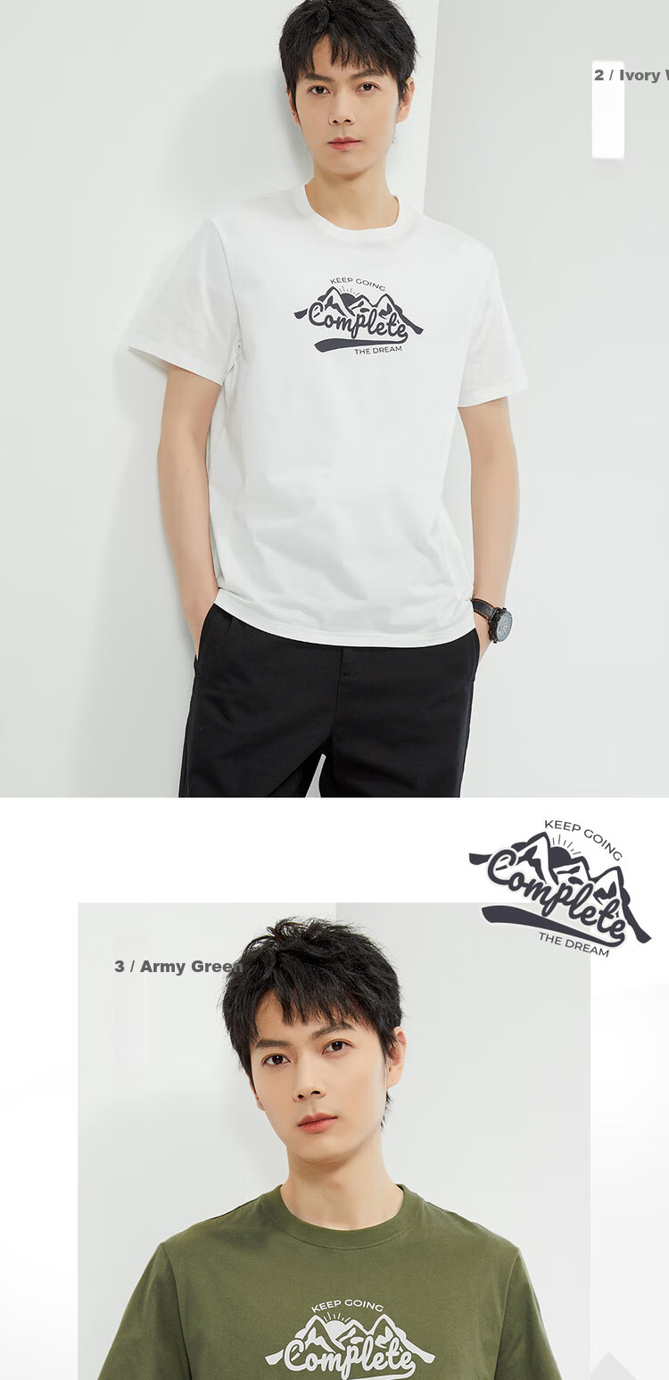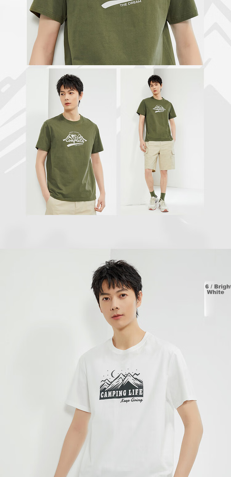 Designs: 1/ White with "Go In", "The Dream", "Camping Life", and "Keep Going" prints; 4/ Ivory with "Activities" prints; 15/ Army Green with "Activities" prints; 2/ White with "The Dream" prints; 3/ Army Green with "Activities" prints; 6/ Ivory with "Camping Life" and "Keep Going" prints
