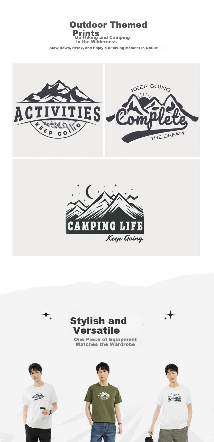 Features: Outdoor theme prints inspired by hiking, camping, and enjoying nature; designed for a relaxed and laid-back outdoor lifestyle
